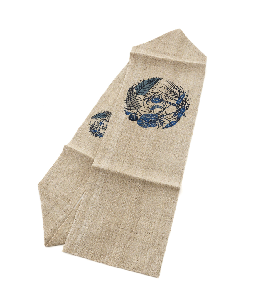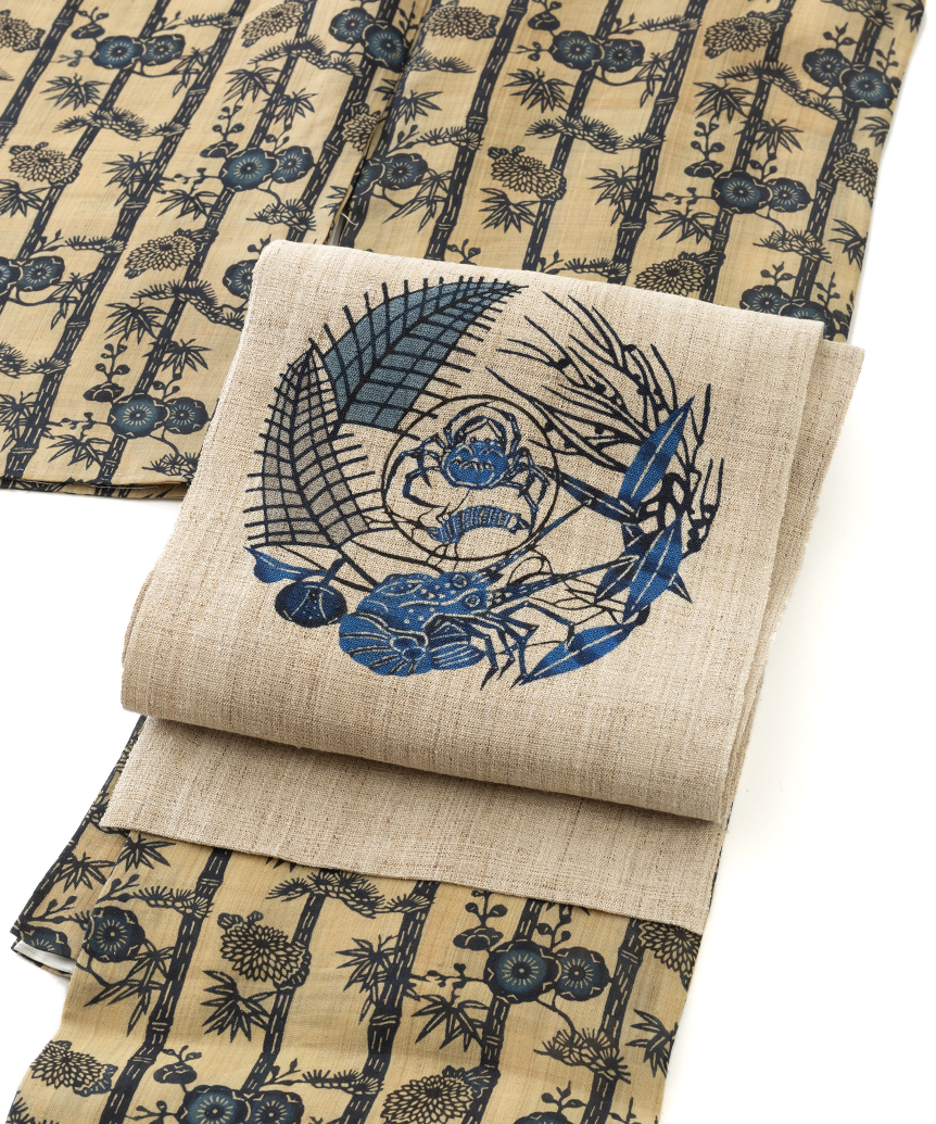 蕎麦切色の越後上布地に、鮮やかな藍の濃淡を用いて、水の中で揺られ漂う水草とともに、大きな海老と蟹を力強く紅型染めした、個性的な表情を持つ可愛らしい生物、涼やかな配色が夏の装いを引き立てる、軽くしなやかな風合いに涼感が漂う玉那覇有公さん作 重要無形文化財 越後上布 八寸名古屋帯。
