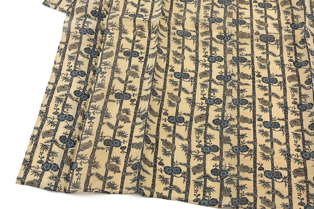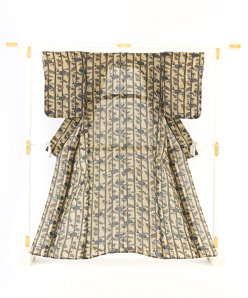 軽やかで独特の張りを備えた芭蕉布地に、藍の濃淡を用いて、すらりと背丈を伸ばす竹を並べ、艶やかな梅や菊、松葉や笹の葉などを紅型染めした、経に配された竹が流れるような美しい装いを実現し、竹から除く可愛らしい草花が豊かな表情を生む、涼しい風をはらむ玉那覇有公さん作 本紅型染 芭蕉布 着物。