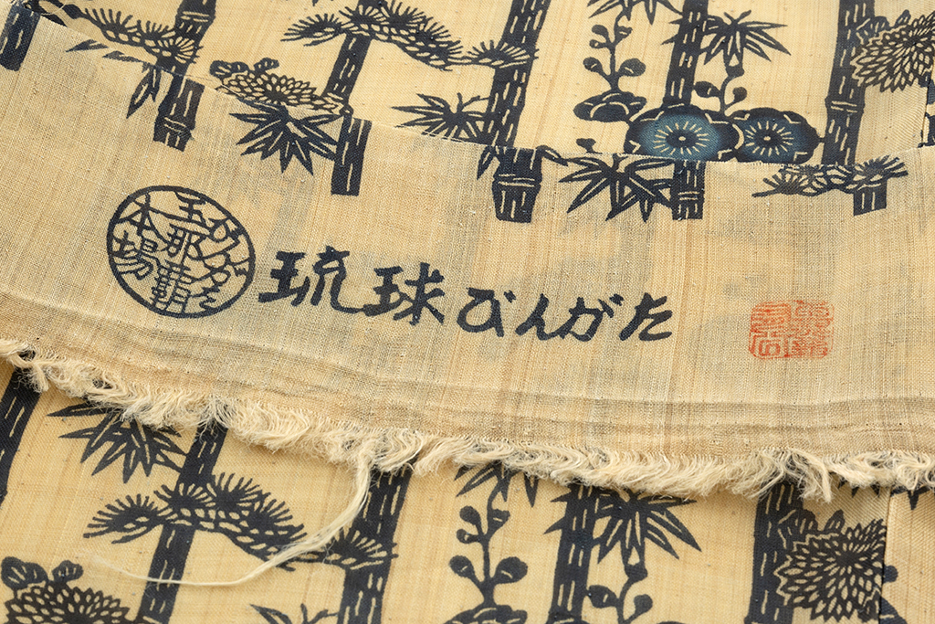 ・人間国宝 玉那覇有公作 本紅型染 重要無形文化財 越後上布 八寸名古屋帯