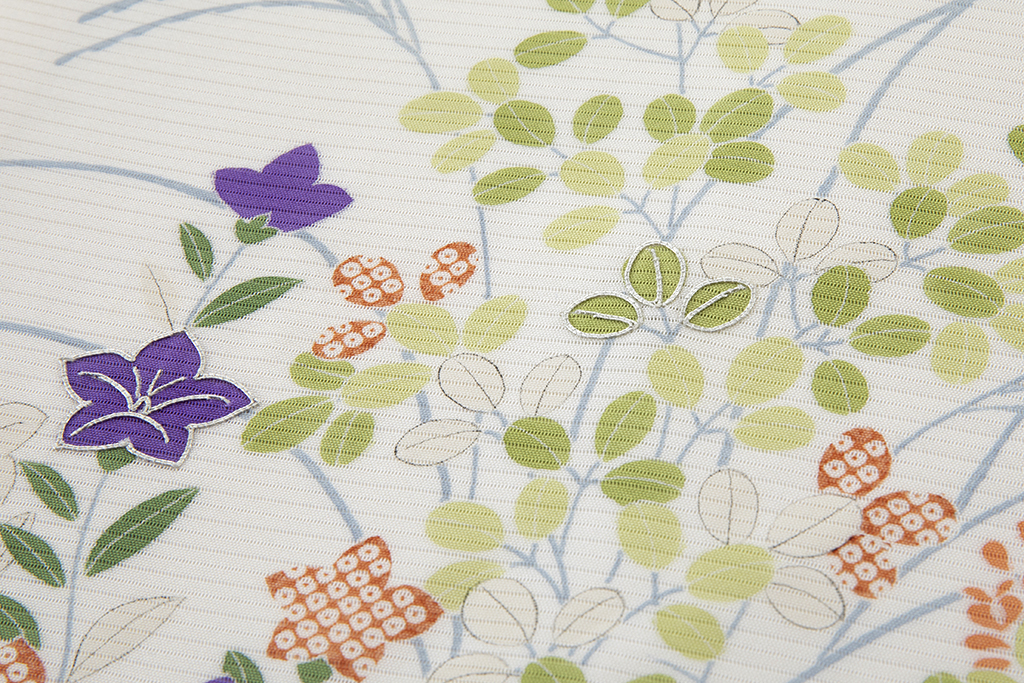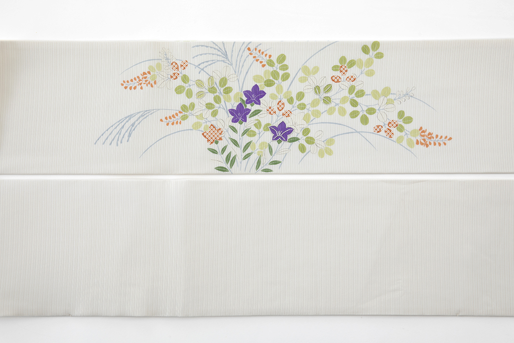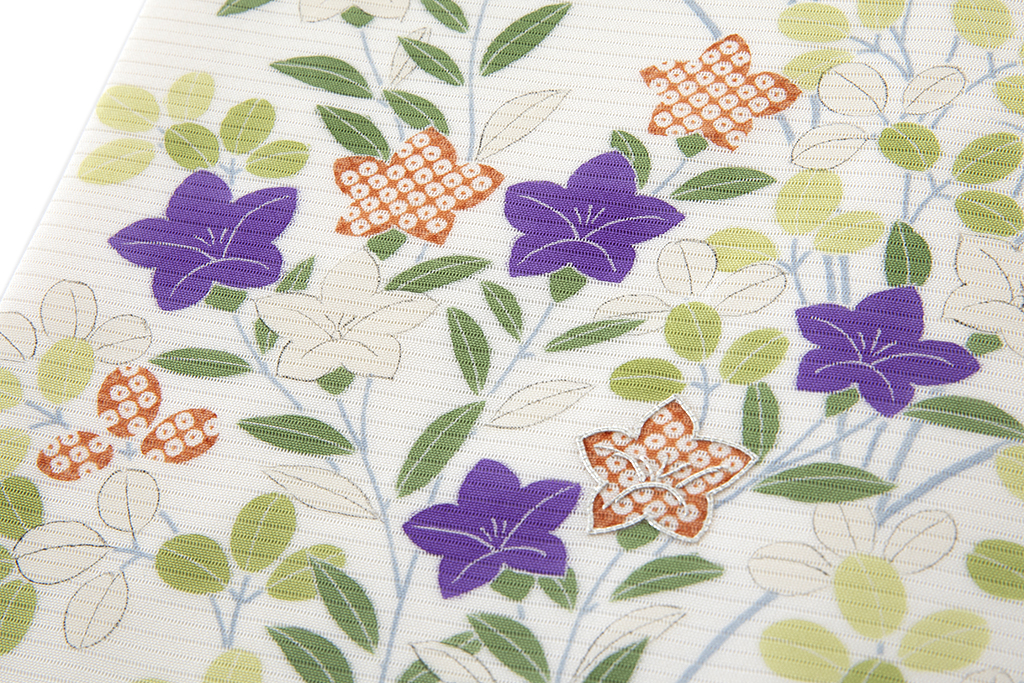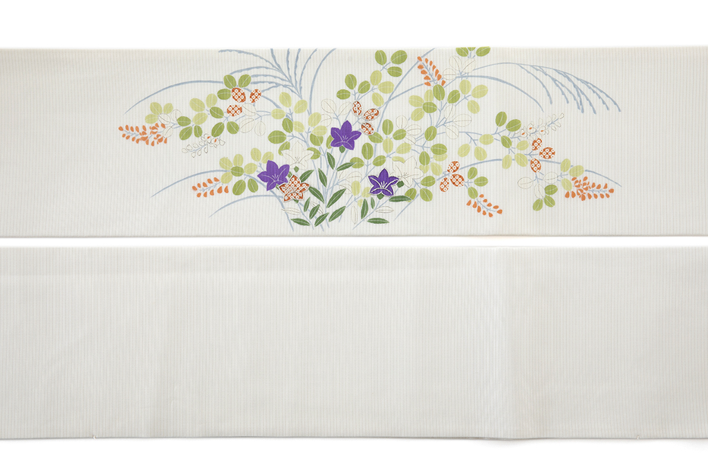 清々しい乳白色の絽の地に、柔らかく上品な配色で、可愛らしい桐や桔梗の花々を涼やかに描いた、女性らしい美しさが引き立つ、ぎをん斎藤製 絽 塩瀬九寸名古屋帯。