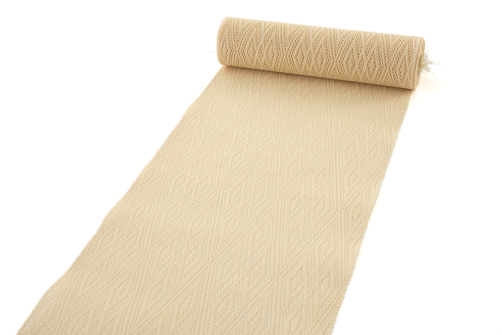 柔らかな練色の糸を用いた、縦横斜めに網目のように広がる複雑で繊細な織で、規則的な菱文様を織り上げ並べた、立体感のある精緻な文様が奥行きを広げ、典雅な景色を生む、格調高い人間国宝 北村武資さん作の羅 八寸名古屋帯地 「上代羅」 。
