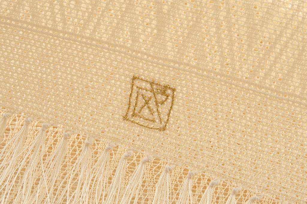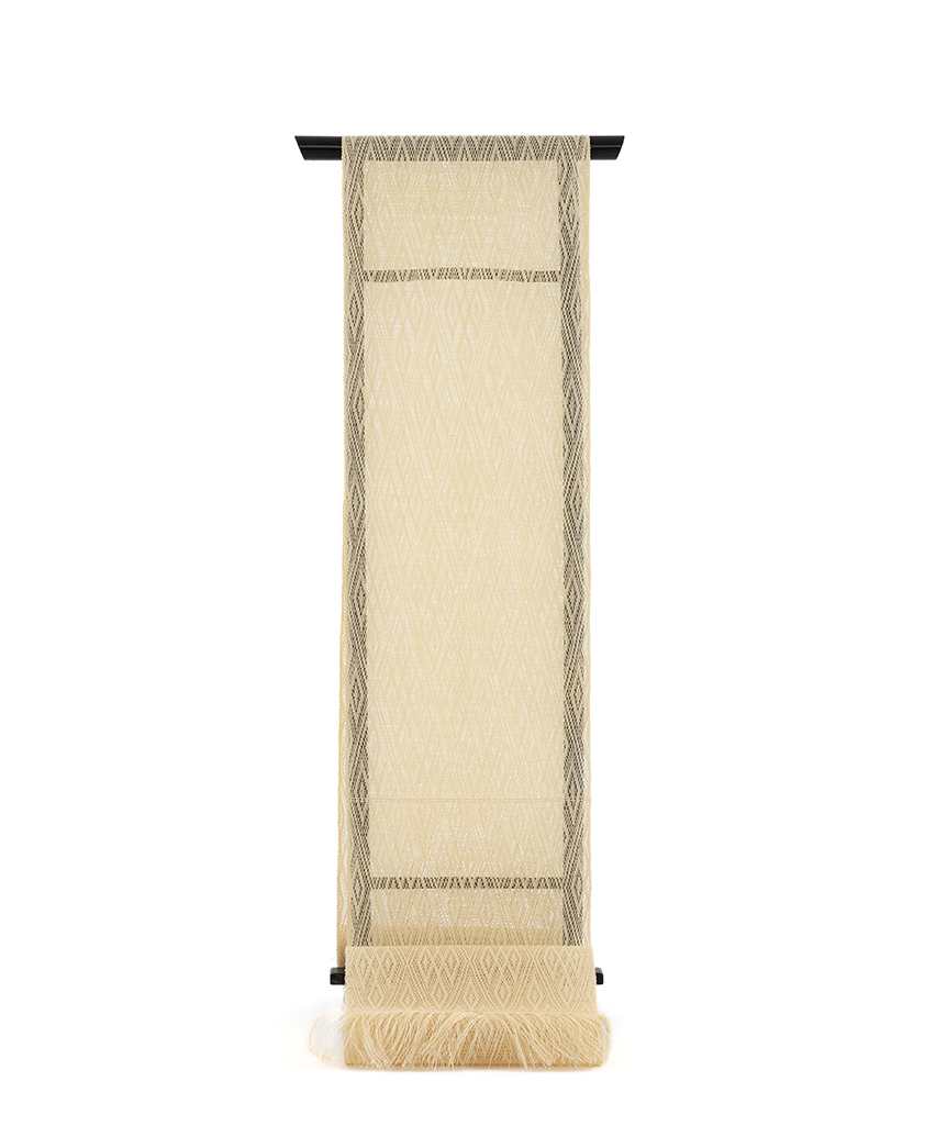 自ら工夫をこらした織り機を考案し、「羅」の再現に成功された、北村武資さんは、その高度な技術を再現するのみで満足することはなく、独自のリズムを刻む透かし文様が有機的な糸の力を引き出す「透文羅」として、〝現代の羅〟を見事に示されました。