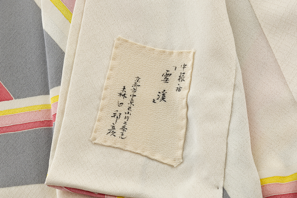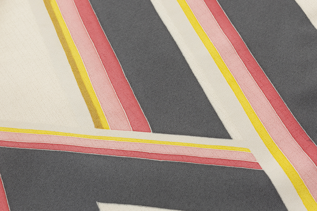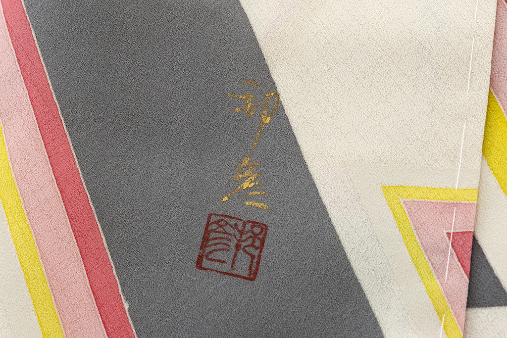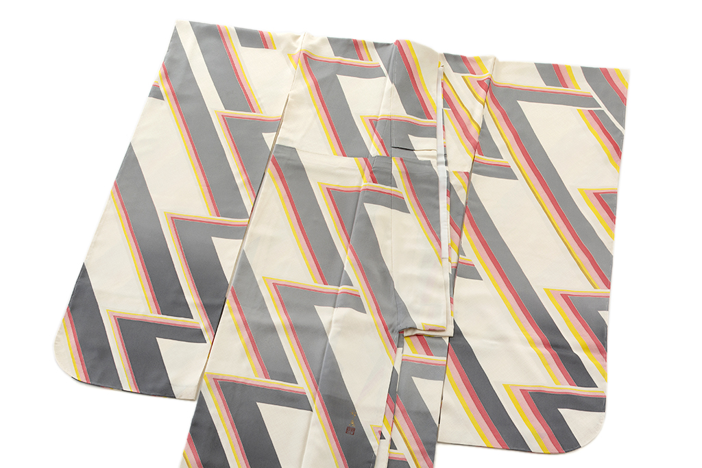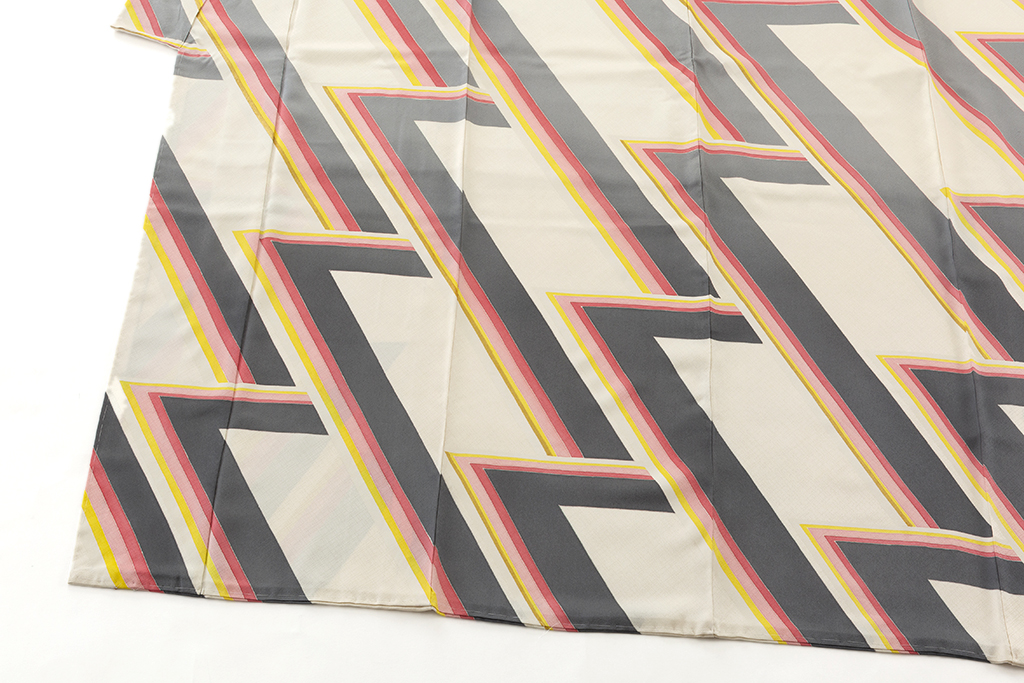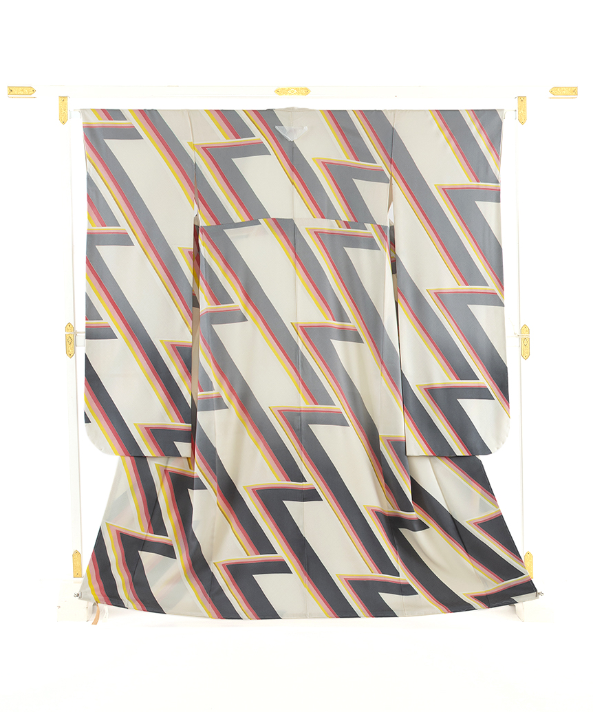 斜め格子の文様が浮かぶ乳白色の地に、勢いのある斬新で大胆な構成で、鋭く屈曲した直線状の幾何文を描いた、繊細な色彩感による僅かなグラデーションが奥行きを生む、高度な技術と立体感までも感じさせるモダンなデザインが格別な個性と美しい気品を漂わせる人間国宝 森口邦彦さん作 振袖 「雲渓」。