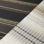 消炭鼠の地に、細やかな経縞を織り出し、よもぎ草、栗などの天然染料を用いて草木染めした、柔らかな渋みと滲み出る味わい深さを表現した、澄んだ空気や流水、清らかな自然の恵みが生んだ、軽やかで柔らかな手触りの日本工芸会正会員 山岸幸一さん作の草木染 双紬糸織 着尺「蓬草染」。