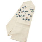 黒の地に、小花や幾何文など様々な柄を散りばめた化粧幕のような幕を垂らし、美しい紅白の梅を丁寧な刺繍と染めで描いた梅見の情景を思い出させる熊谷好博子さん作の九寸名古屋帯です。