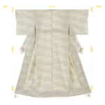 乳白色の地に、板締め技法による細かな亀甲と蚊絣で柔らかな曲線のよろけ縞を織り出した、独特のシボ感とさらりとした風合いが特徴の白鷹お召し 着尺です。