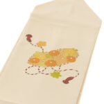 糸目のない友禅技法なので、柄の輪郭がすっきりと立ち上がっているのも、志ま亀のこだわりの1つで、いかにも典雅な筆づかいで、花兎、鼓、扇面、宝尽くし、松葉、玩具などの古典的なモチーフが詩的に描かれる塩瀬染め帯も高い人気を集めています。