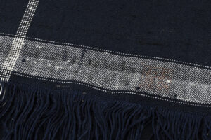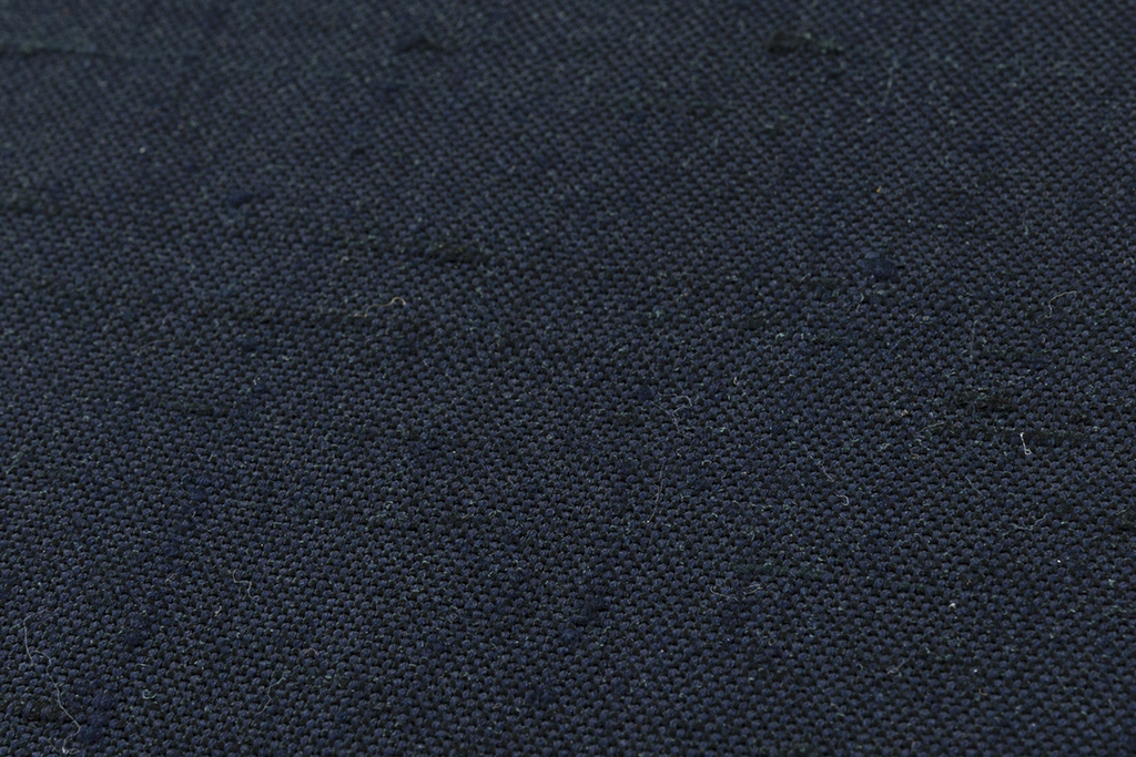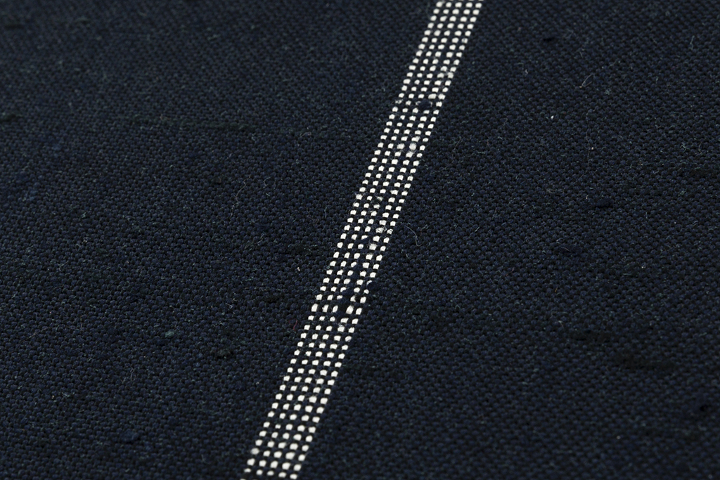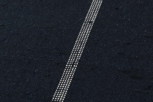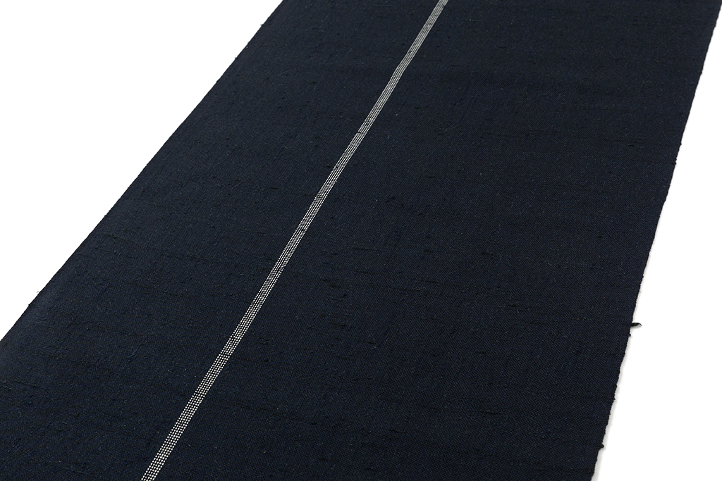 極太に撚った玉糸を用いた濃紺の地に、経にほっそりとした白の線を織り出した、地厚ながらもしなやかで、趣ある節が布味を引き立てるざざんざ織 着尺です。