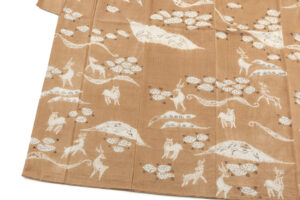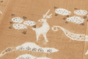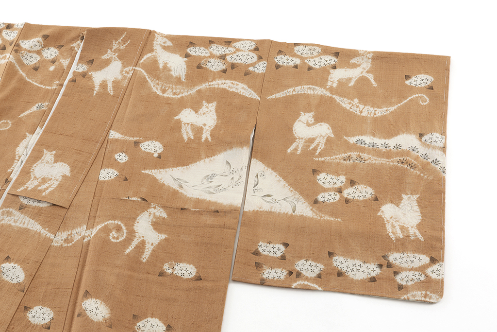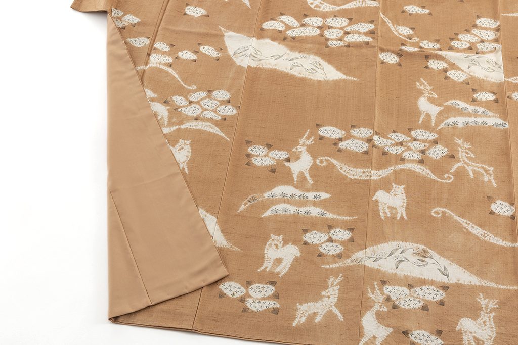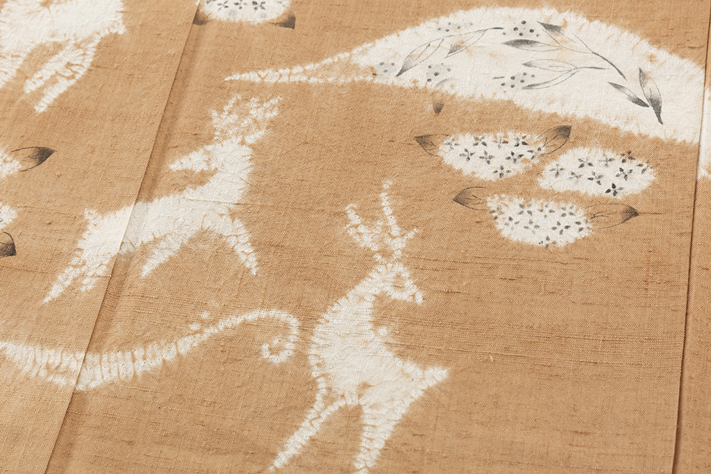 薄茶色の野趣豊かな紬地に、柔らかく滲む絞り、すっきりと際立つ繊細な手挿しや型絵染めなどの様々な技法を用いて、穏やかな風が吹き抜ける丘の草葉、紫陽花のようにふわりと咲き開き集まる花々、そこに集まり、心地よく散歩しながら会話でもするかのような様々な動きや表情を見せる鹿たちを描いた、ほのぼのとした可愛らしい作風が浮かび上がる動植物に温かな生命を宿らせ、個性豊かな和やかな情景が広がる鈴木紀絵さん作 型絵染 紬訪問着です。