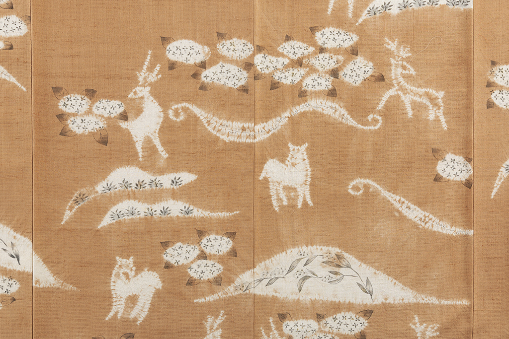 鈴木紀絵さんは、絞りや型絵染め、手挿しなど様々な技術を自由に取り込み、動植物を描いた愛らしいのどかな世界感を表現され、ふんわりと優しさに溢れた夢のある作品が特徴です。