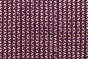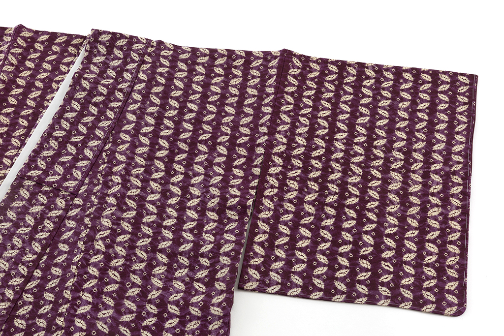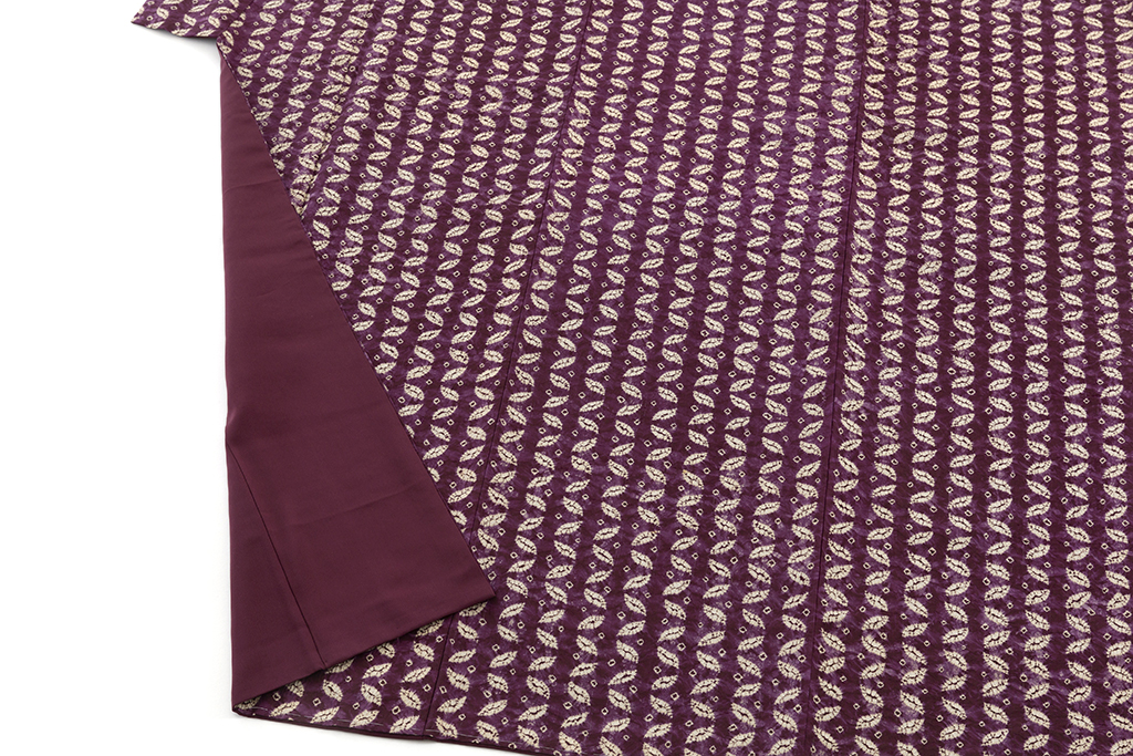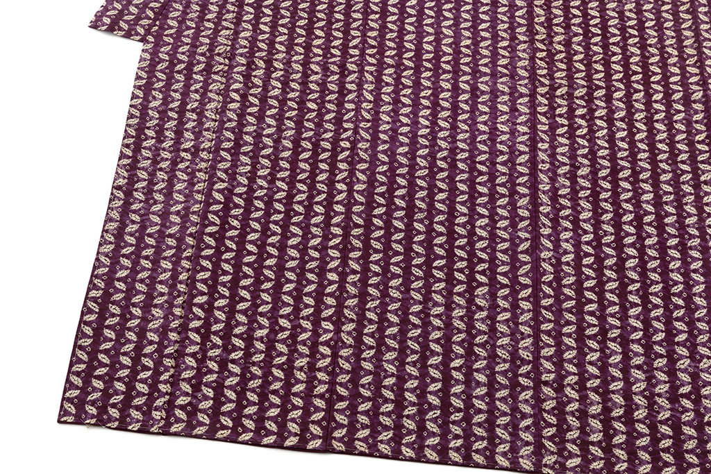 深く渋みのある茄子紺で、小さな葉のような文様を幾何文とともに精緻に並べ、絞り染めした、それぞれの絞り模様が柔らかな滲みとともに可愛らしい表情を魅せる南部紫根染 紬着物です。