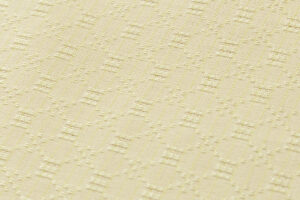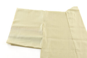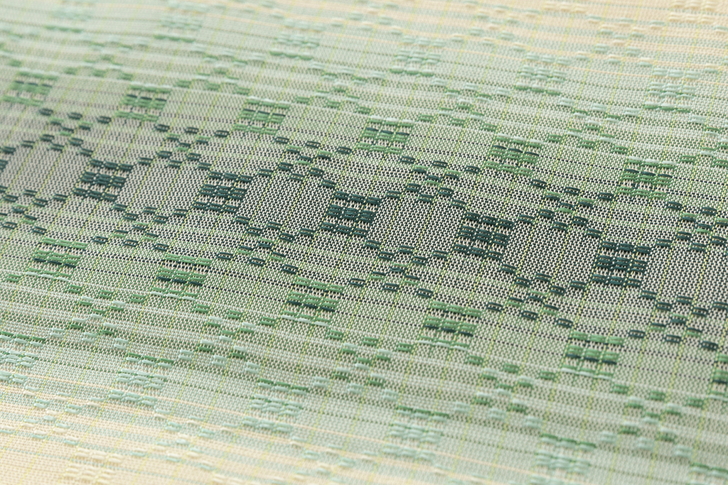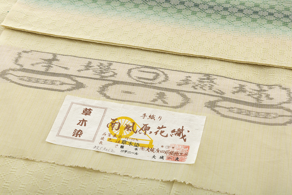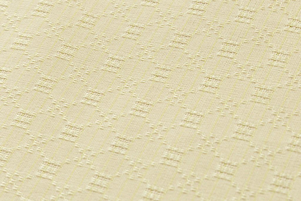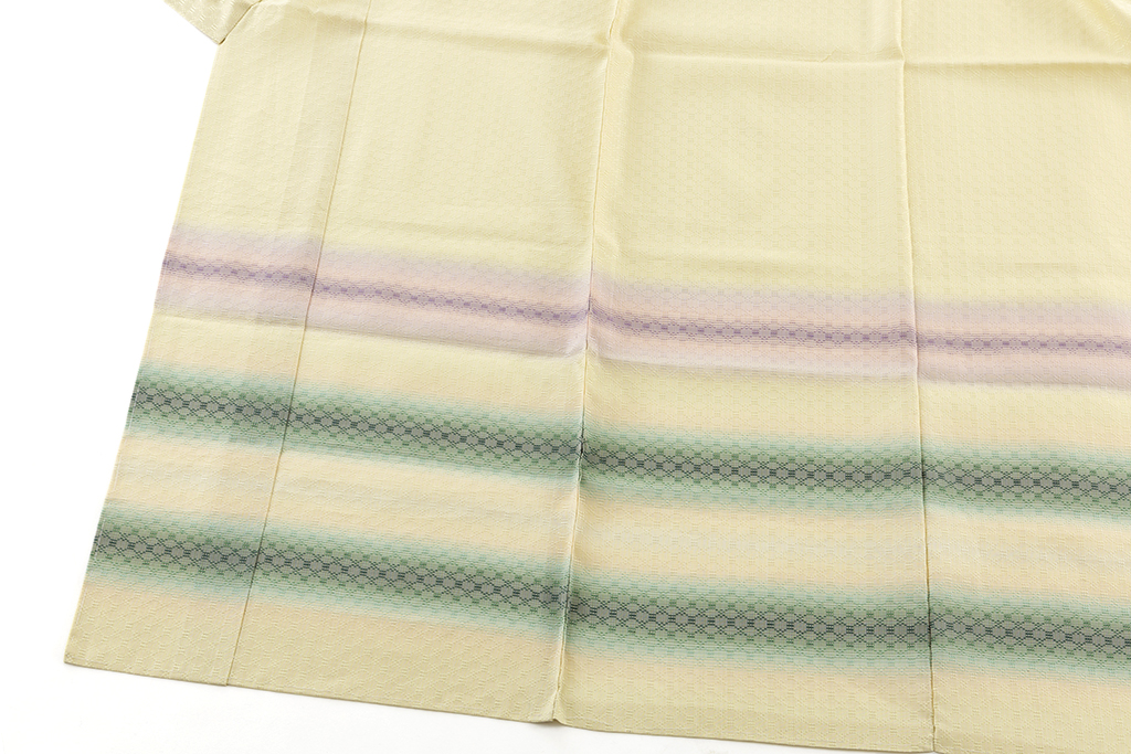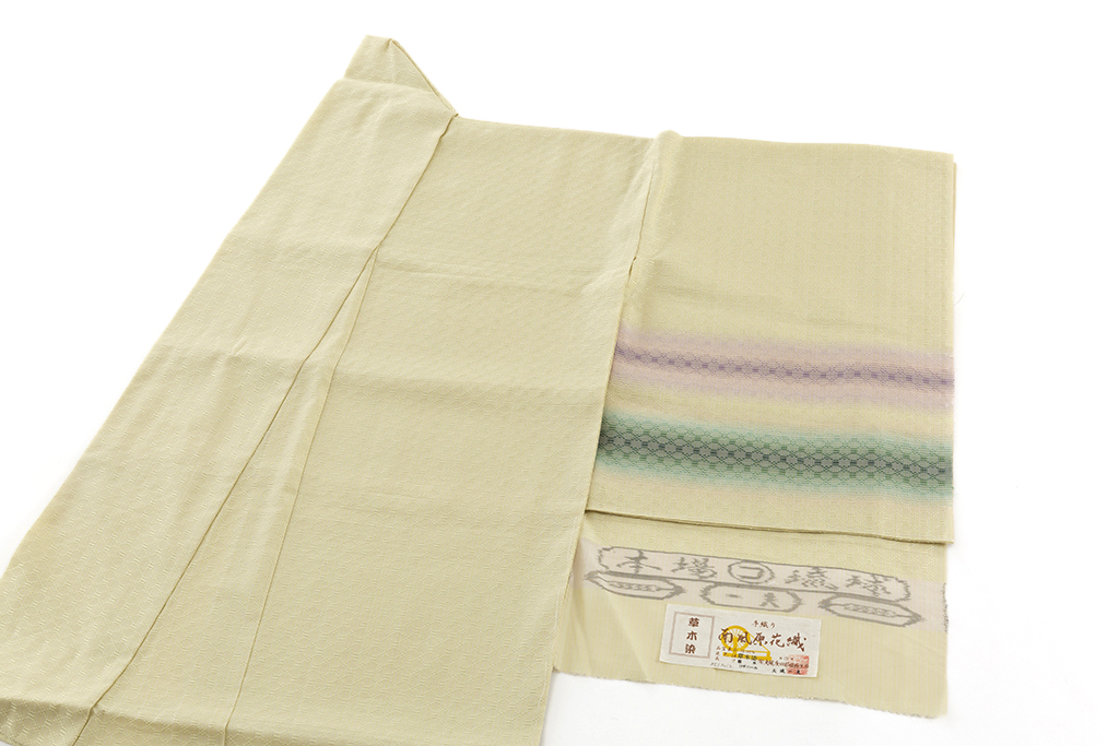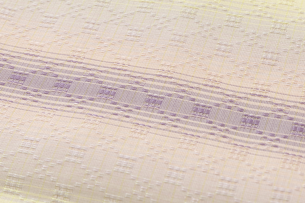 淡く透き通るような魚子黄の地に、ふっくらと細やかで緻密な花織を敷き詰め、柔らかく滲むような艶やかなグラデーションを織り出した、色彩の移ろいが奥行きと麗しい着姿を演出する日本工芸会正会員 大城一夫さん作 南風原花織紬 訪問着地です。