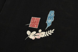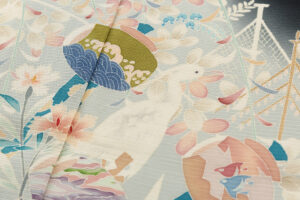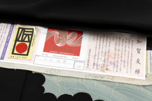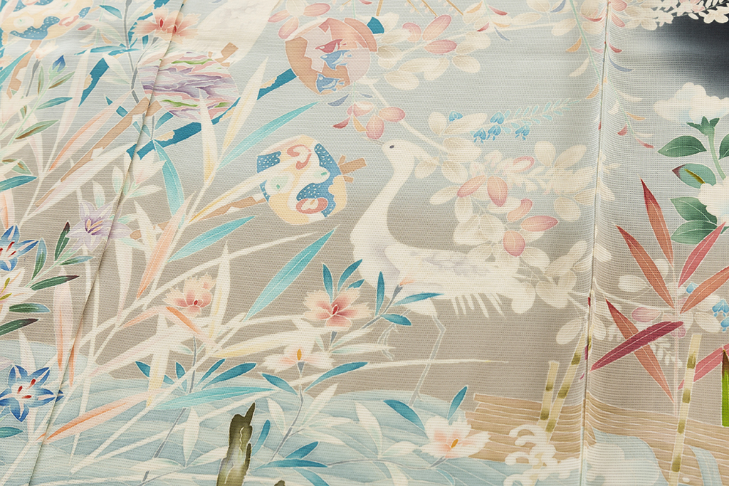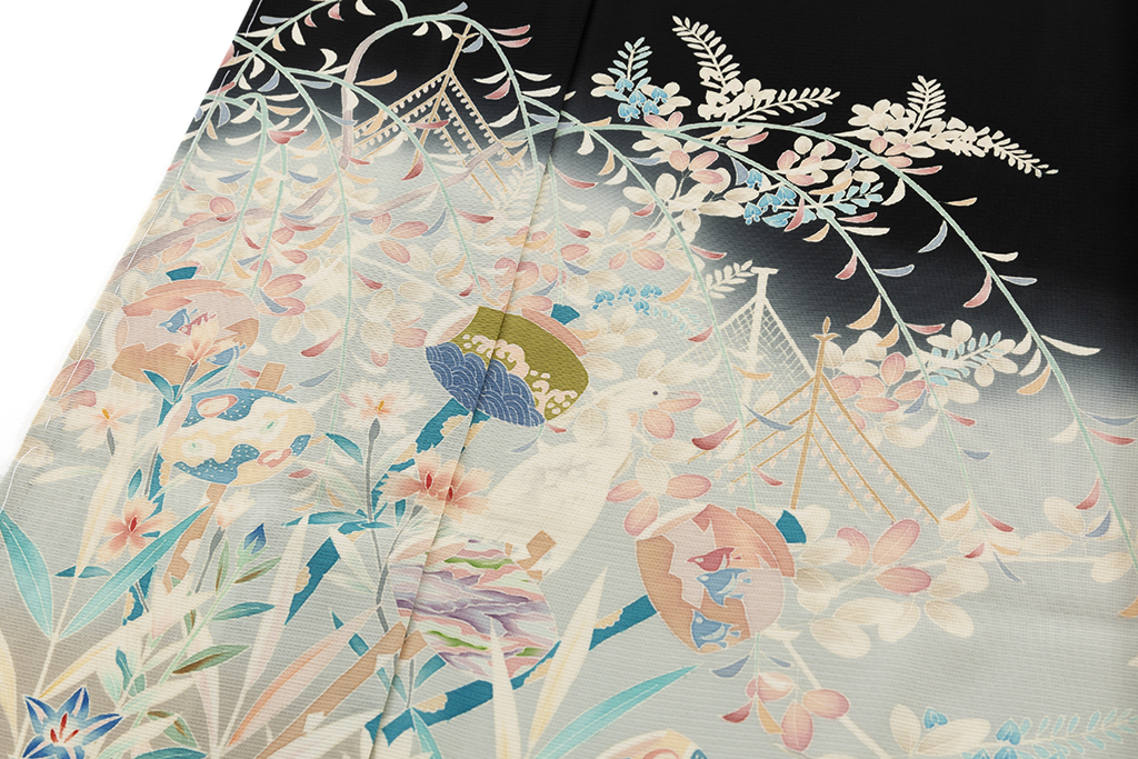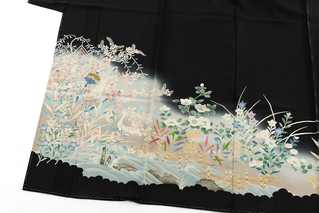 黒の絽の地に、柔らかな加賀友禅の色彩で、波打つ川沿いに、菊や桔梗、撫子を咲かせ、静かに佇む鷺と共に可愛らしい小槌を添えた、西村央さん作 本加賀友禅 絽 留袖地です。