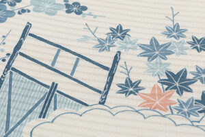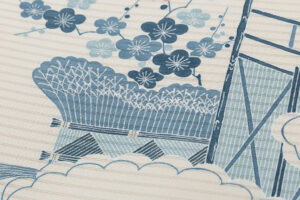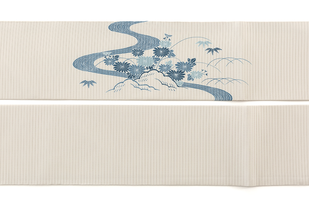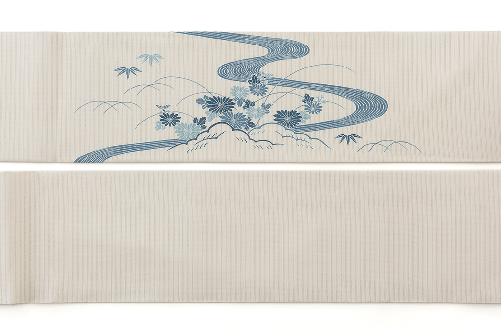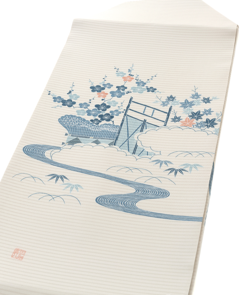 淡い灰白色の絽の地に、繊細な藍の濃淡を用いて、緩やかに流れる流水の脇に佇む茶屋辻、その周りに梅や紅葉、菊を柔らかく咲かせた、和やかな情景とともに清々しい藍の世界が広がる田畑喜八さん作 絽 塩瀬九寸名古屋帯です。