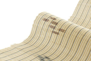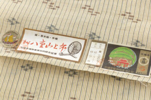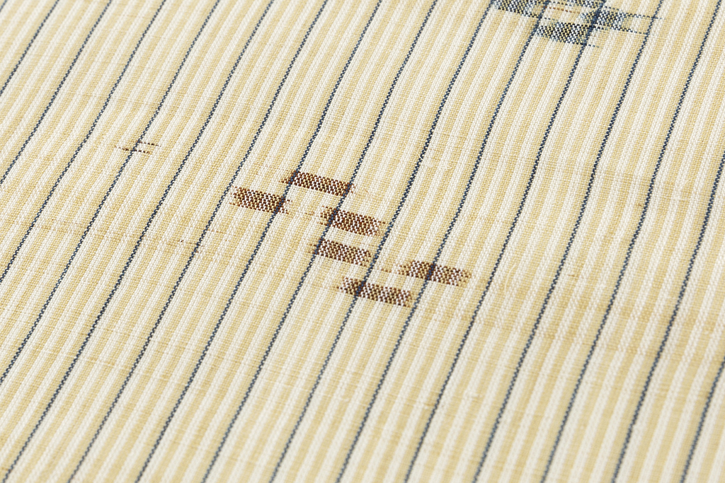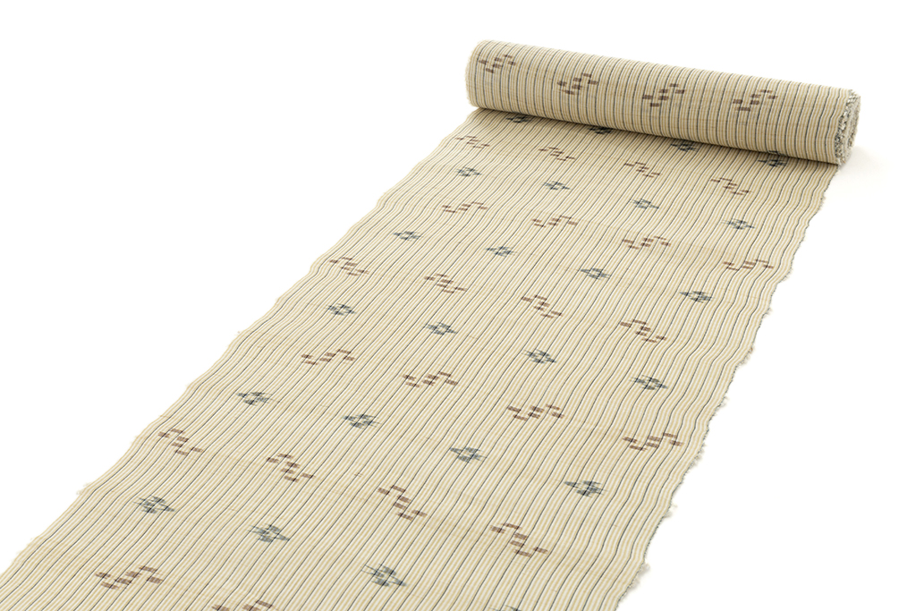 沖縄地方の織り物の中で唯一「刷込捺染技法」を用いて作られる織物で、焦げ茶色の絣模様が浮かび上がる清涼感あふれる白上布は、主に夏用の着物として用いられます。