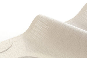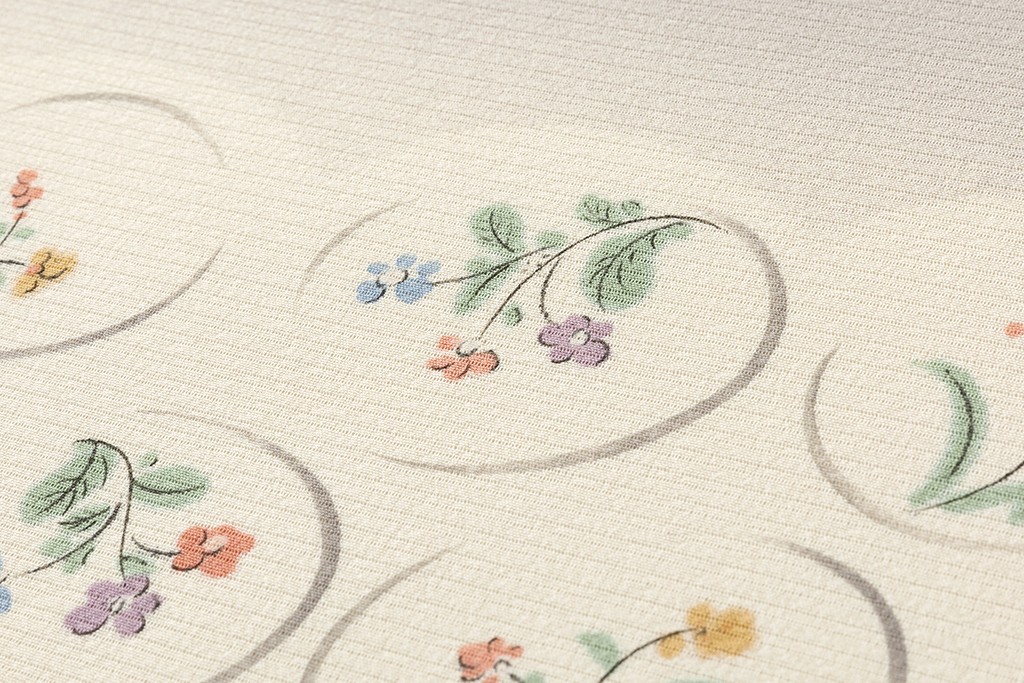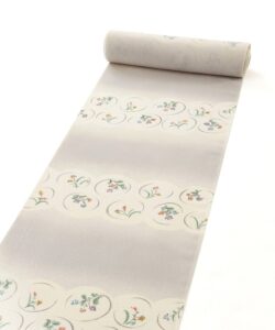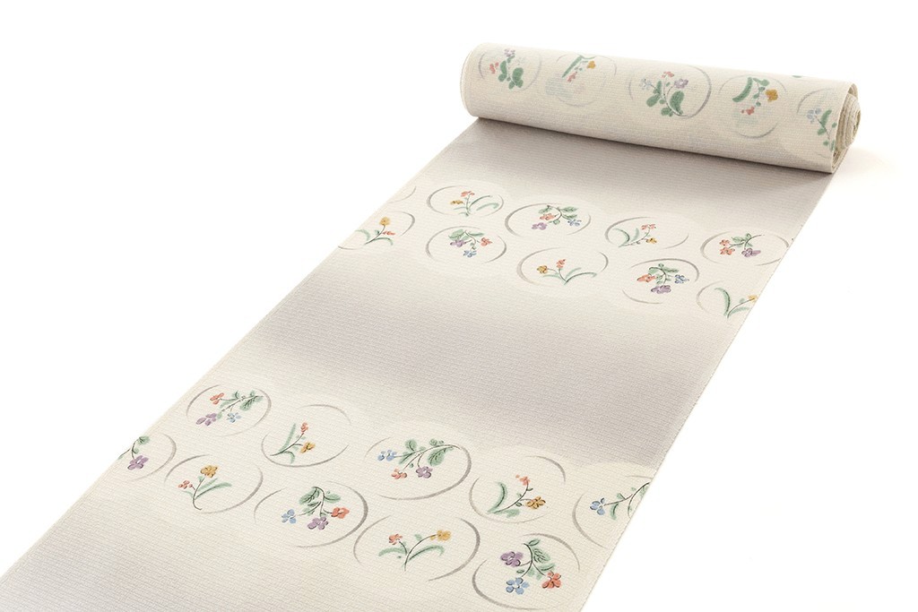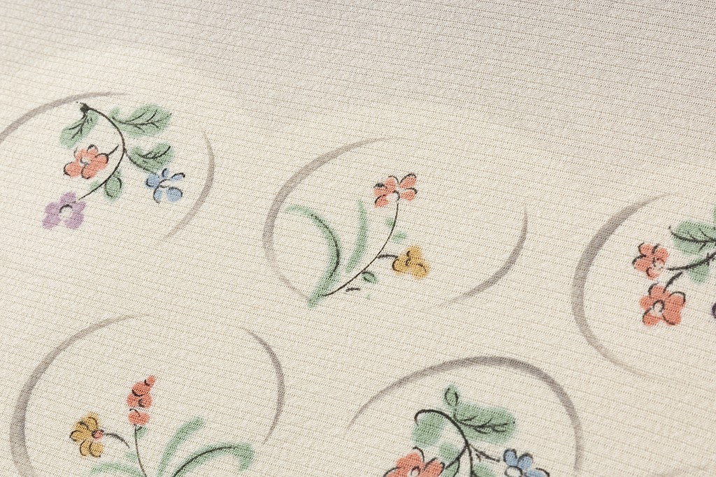 柔らかな銀白色の絽の地に、優しい色彩感でゆらゆらと風に揺られる可愛らしい小花を描いた、穏やかな情景が涼やかさを演出する、工芸きもの野口製 絽 小紋 着尺です。