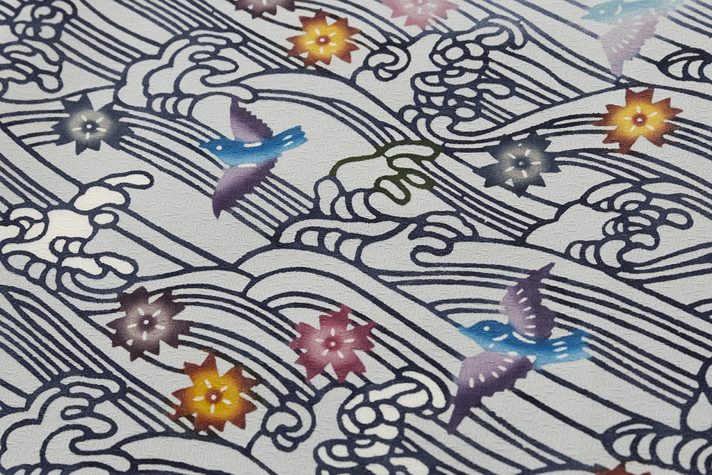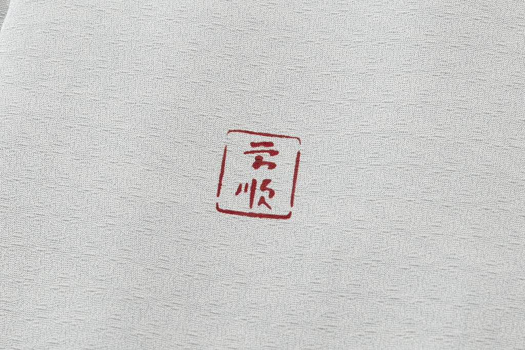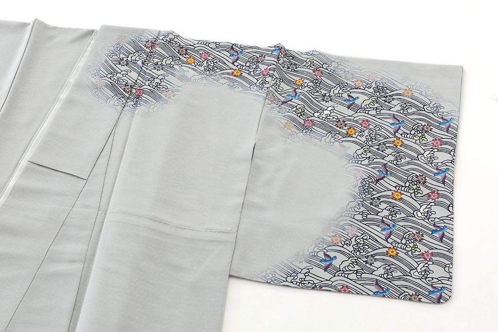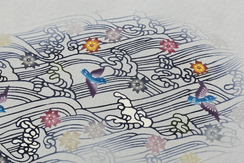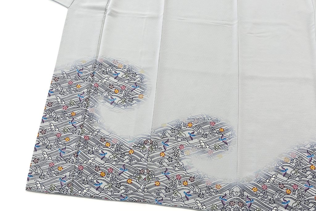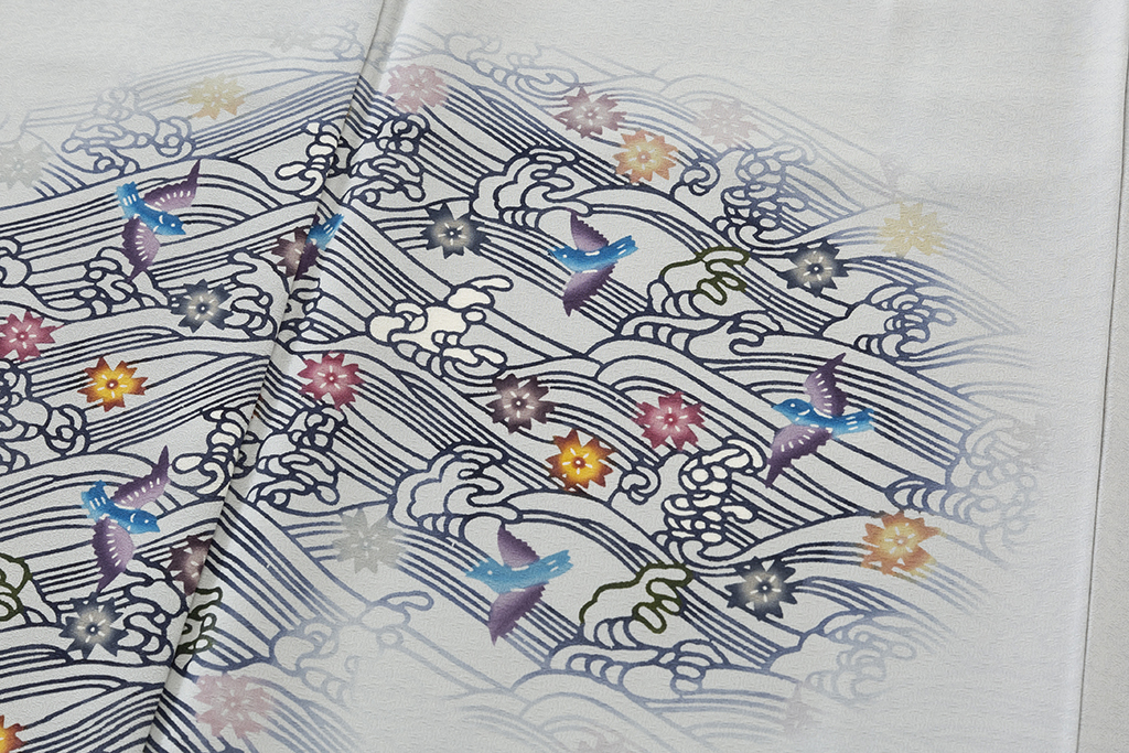 地紋の入った魚肚白の地に、うねるように飛沫をあげる高波に、鮮やかなお色で飛び交う小鳥や小花を散らした、柔らかな暈しが陰影を深め、品の良い美しさを高める日本工芸会正会員 城間栄順さん作 本紅型染 訪問着です。