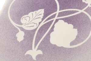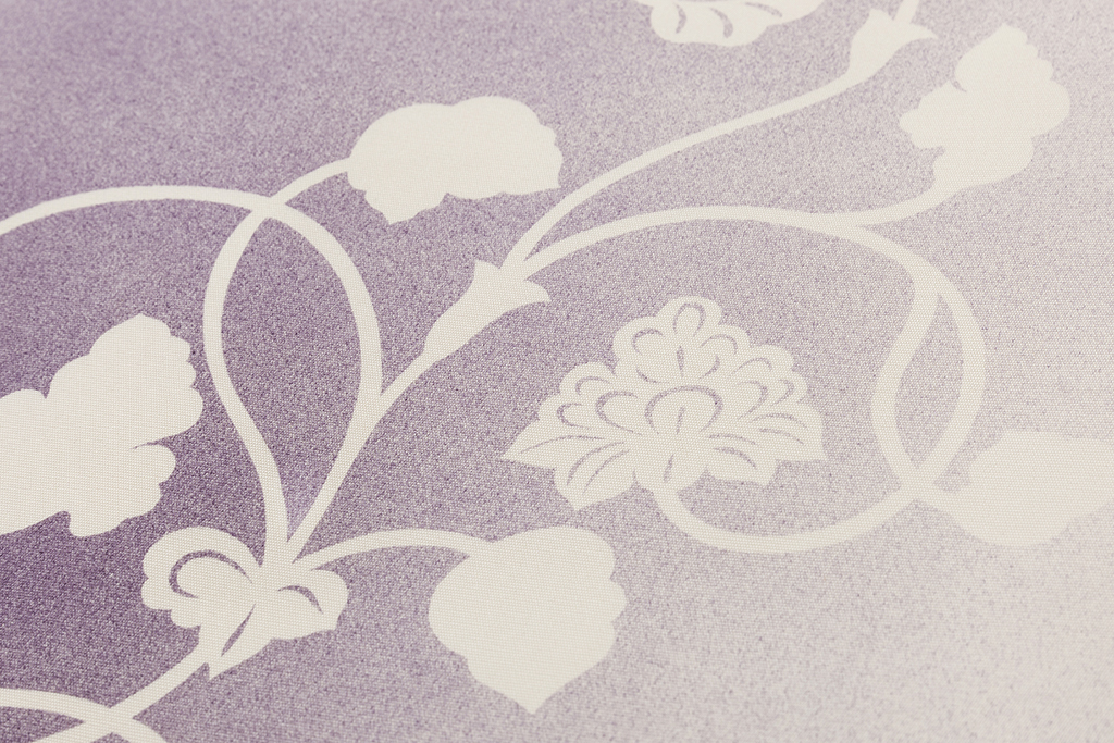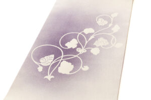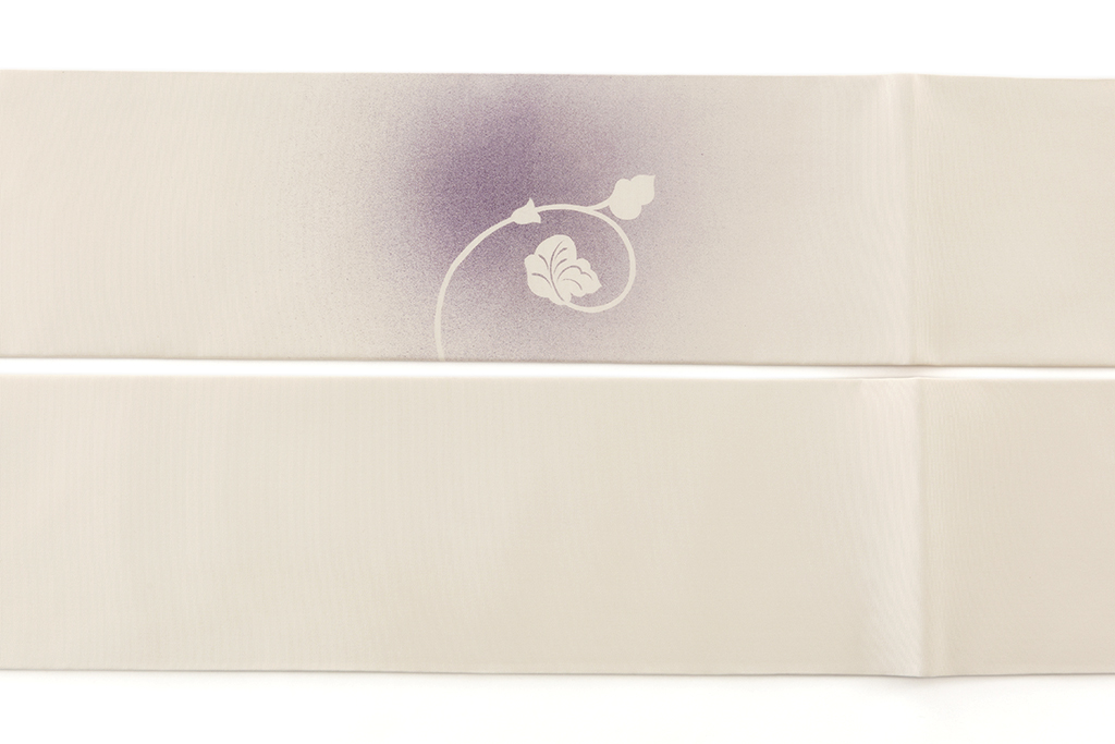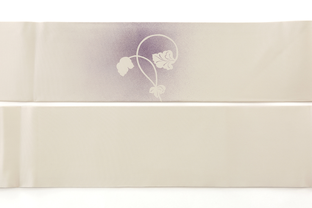 優しい真珠色の地に、美しい紫の濃淡の霞に柔らかな唐草文様を描いた、霞のように配された色彩が艶やかな印象を与え、高貴な色彩の中に浮かび上がる緩やかな曲線が女性美を引き立てる染司よしおか製 塩瀬九寸名古屋帯です。
