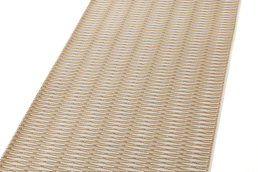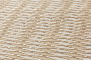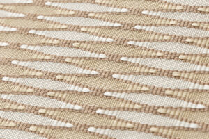 澄んだ白の地に、柔らかな鉛白と亜麻色の糸で、平織と綴織の技法を併用した織繧繝の技法を用いて、織の密度の変化で立体感のある魚子縞を、層をなすように端正な景色を繰り返し織り出した、上質な気品の香る人間国宝 北村武資さん作 繧繝錦 袋帯地 「魚々子縞(ななこじま)」です。