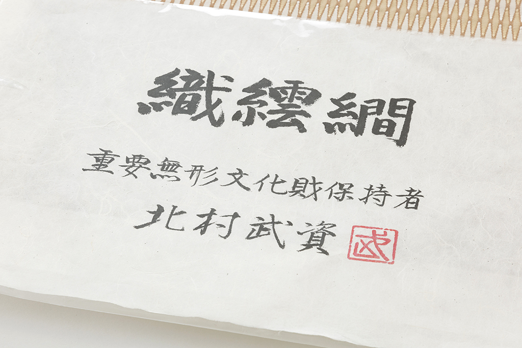 中国・前漢時代に、織られていたとされる「羅」は、日本でも室町時代中頃までは織られていましたが、中世以降衰微し、応仁の乱以降はほとんど織られなくなりましたが、1972年の「二千百年の奇跡中国・長沙漢墓写真展」での一枚の写真に映し出された、貴人の棺の内張りとしての羅との出会いを機に、北村武資氏が、「羅」の再現への取り組みを始め、自ら工夫をこらした織り機を考案し、約一年をかけて再現に成功されました。以後さらに現代性を加えた新しい羅の世界を広げられ、1995年に国の重要無形文化財保持者に認定されました。また、北村武資氏は、その高度な技術を再現するのみで満足することはなく、独自のリズムを刻む透かし文様が有機的な糸の力を引き出す「透文羅」として、〝現代の羅〟を見事に示されました。