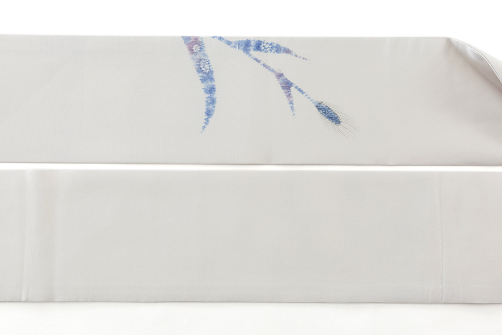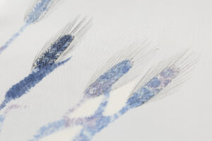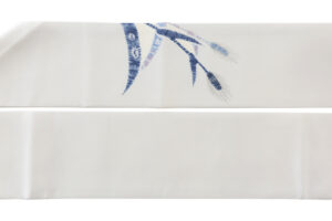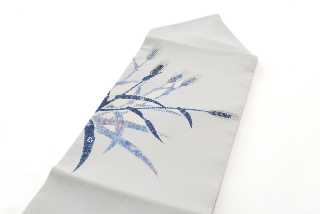 清冽な月白の地に、洗練された色彩が移りゆく美しいグラデーションを用いて、柔らかな滲み、味わい深い掠れを生む繊細な絞り染めし、風に揺られながらひっそりと佇む狗尾草を描いた、静穏な空気に品のある美しさが漂う日本工芸会正会員 小倉淳史さん作 塩瀬九寸名古屋帯です。