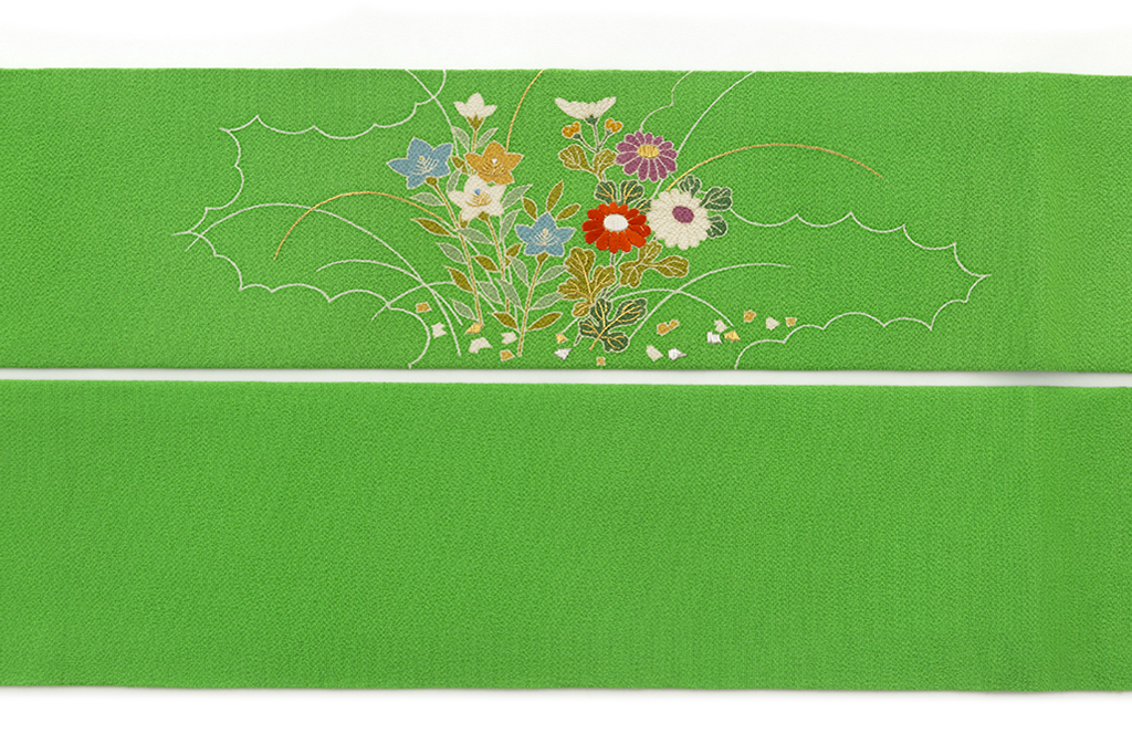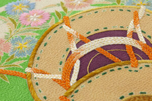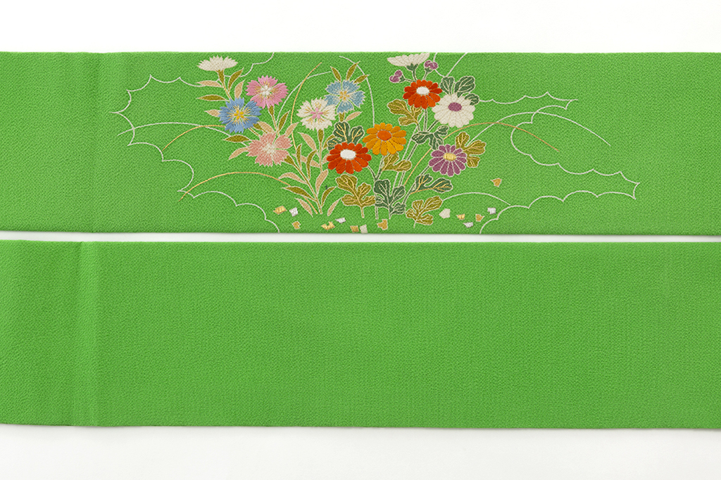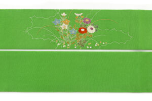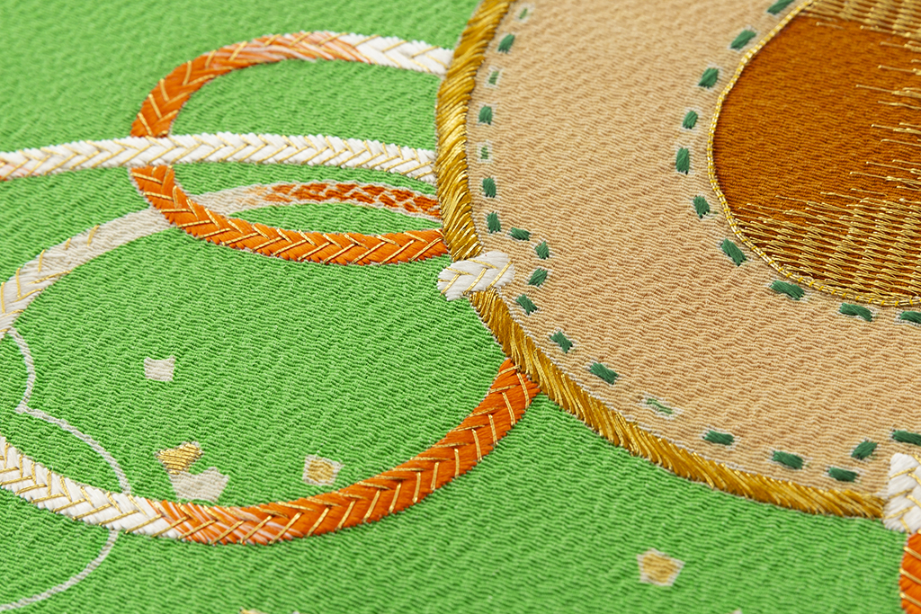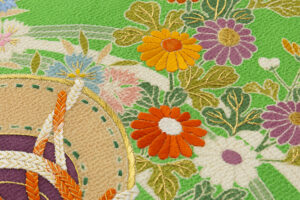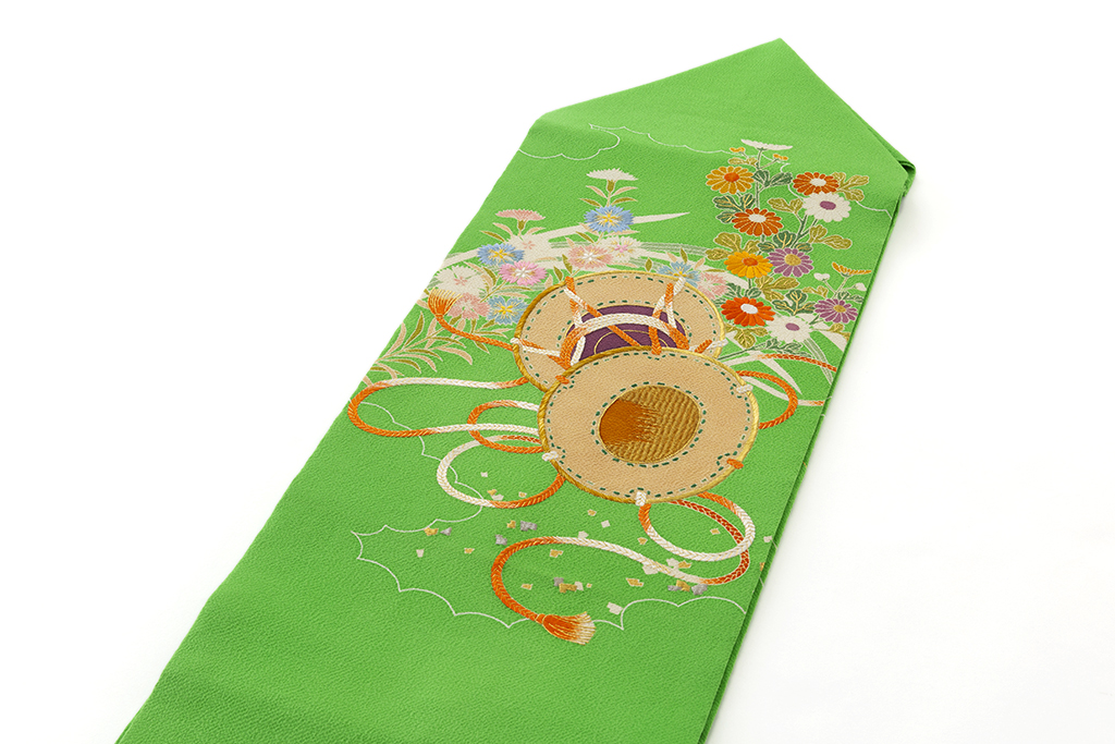 明るい彩の新緑色の地に、鮮やかな色糸、煌めく金糸を用いた極め細かく丁寧な刺繍を用いて、迫力満点の鼓を力強く描き、撫子や桔梗、菊などの可憐な花々を描いた、ふっくらとした密度の濃い刺繍が奥行きを生む、重厚な存在感のある東京染繍大彦製 九寸名古屋帯です。