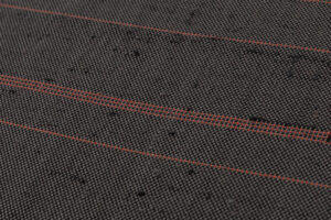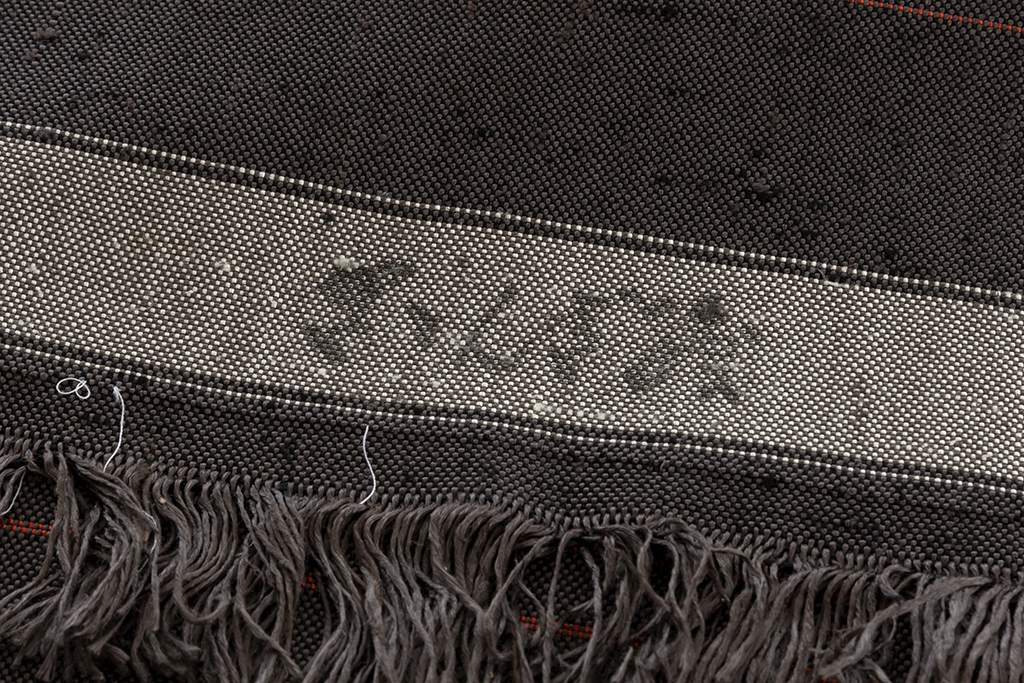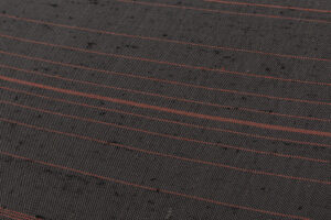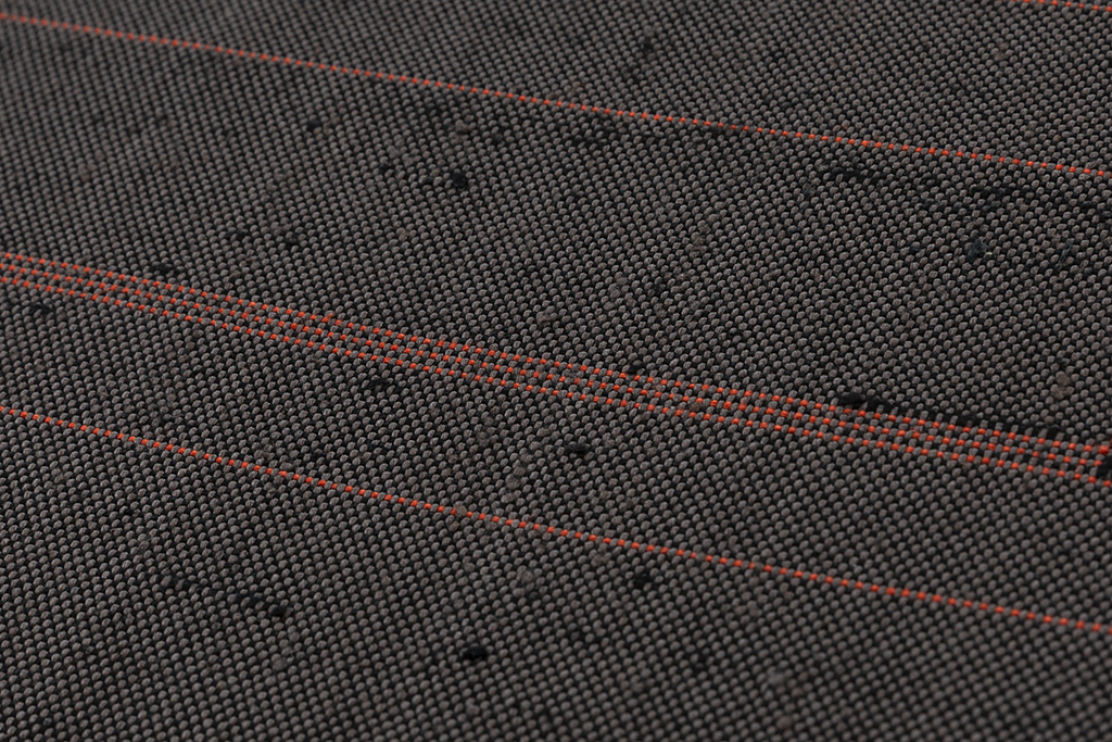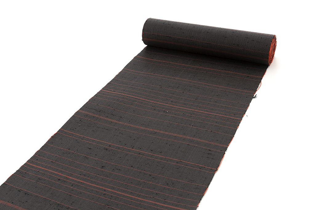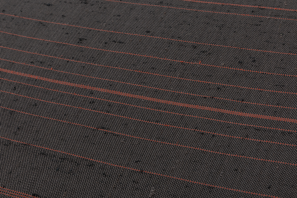 渋みのある黒鼠に明るい朱色の横縞を織り出した、不規則なリズムが工芸色豊かな表情に奥行きをもたせる、どっしりとした風合いながらもしなやかな手触りと玉繭から引いた節のある糸ならではの布味が味わい深いざざんざ織 着尺です。