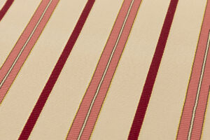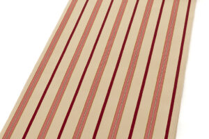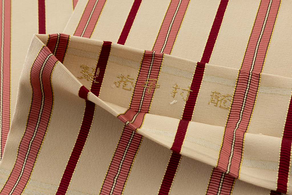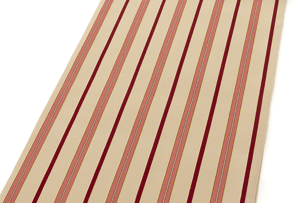 練色、紅梅色、正臙脂の柔らかな色彩に、畝の立体感が美しい真田織が織り出す端正な景色が清々しい印象を与える、落ち着いた色目が着装の幅を広げてくれる龍村平蔵製 袋帯 「日野間道」です。