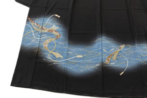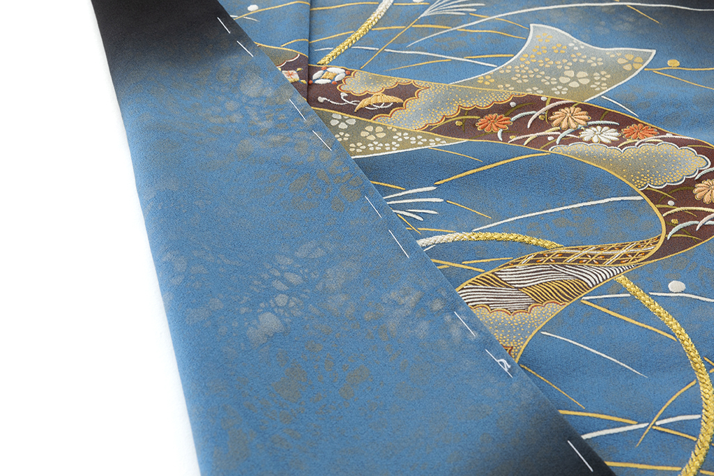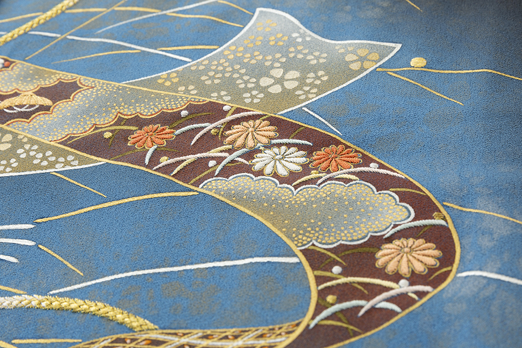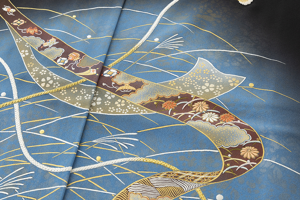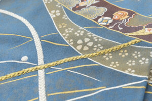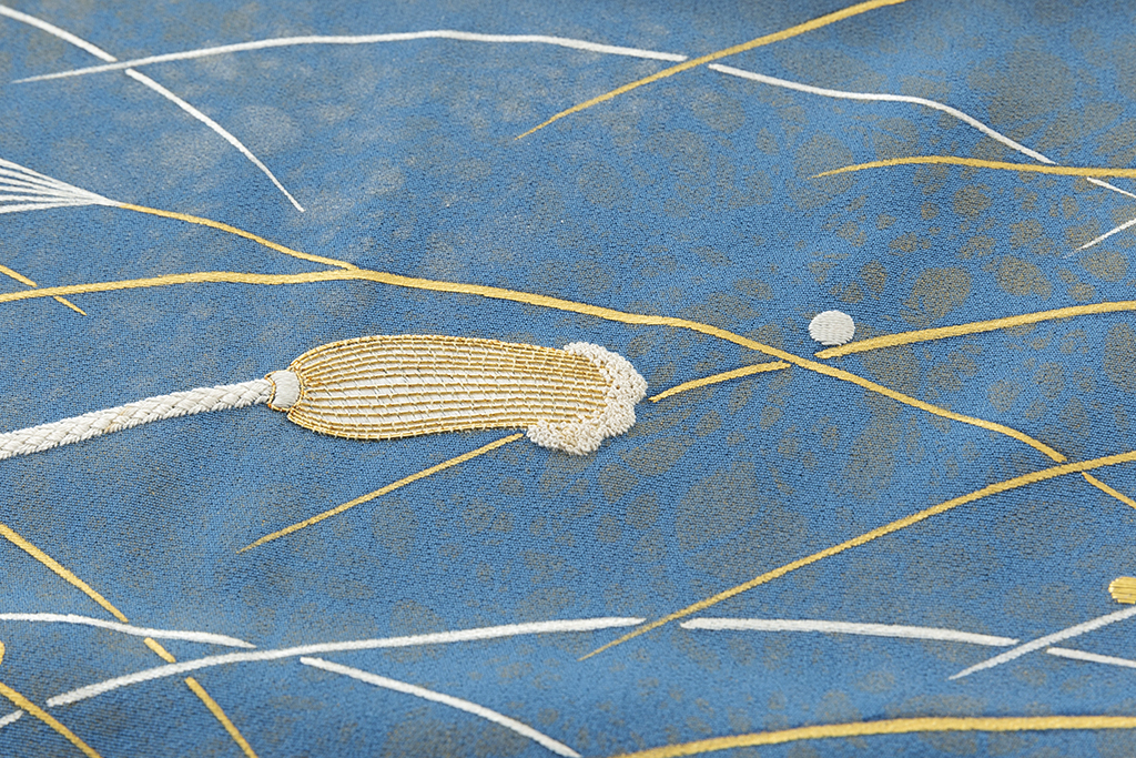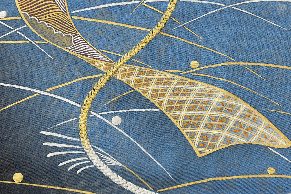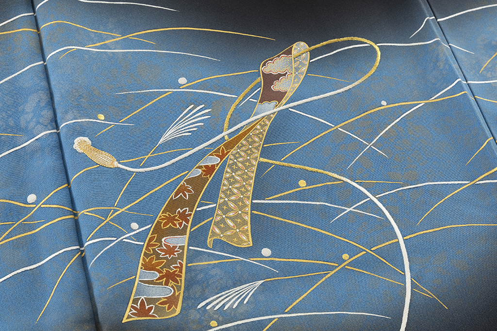 うっすらと金彩を散らした天色の柔らかな霞に、細やかな刺繍を施した菊や宝尽くし文様で可愛らしく飾られた熨斗とともに、金糸、白糸を用いた綿密な刺繍で表現された組紐がひらりと舞う、優美な品格が漂う人間国宝 福田喜重さん作の刺繍 留袖地です。