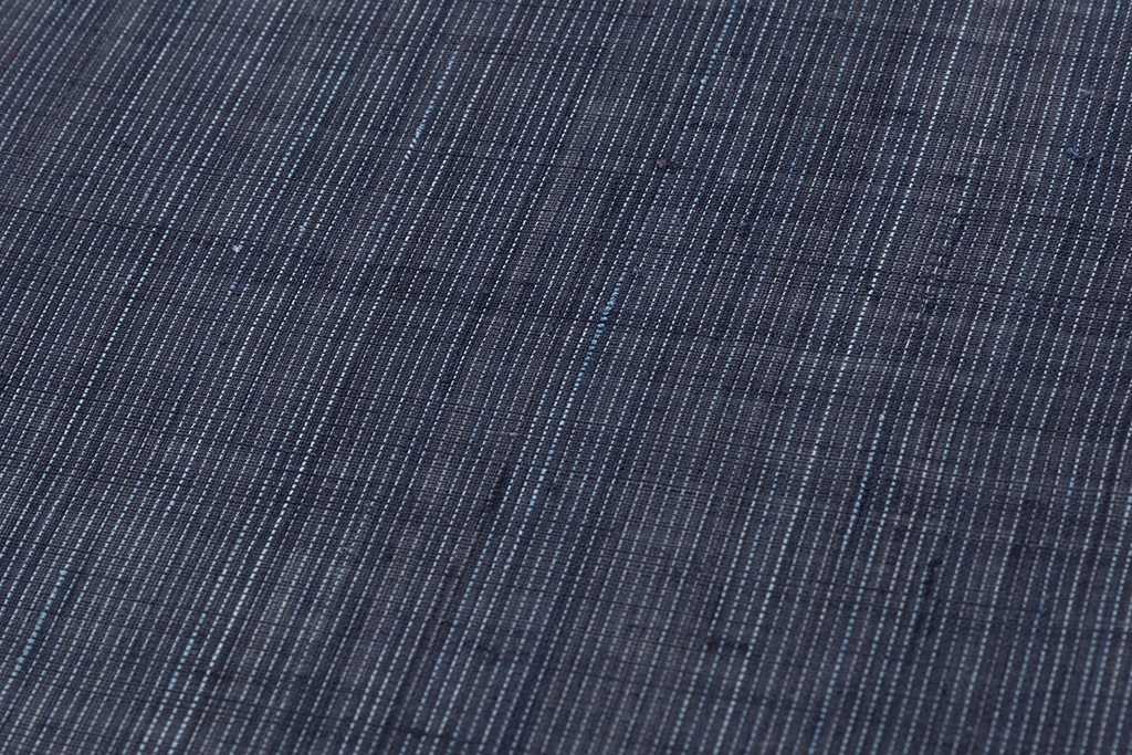 澄んだ濃藍の極細の苧麻糸で細やかな縦縞とともに織り上げられた、涼しく爽やかな地風が軽やかで、ひんやりと肌触りの良い、日本工芸会正会員 鈴木苧紡庵さん作 重要無形文化財 越後上布 着尺です。