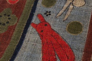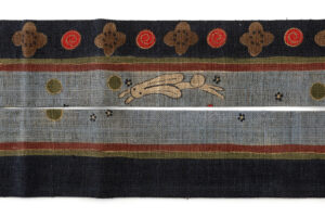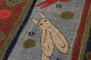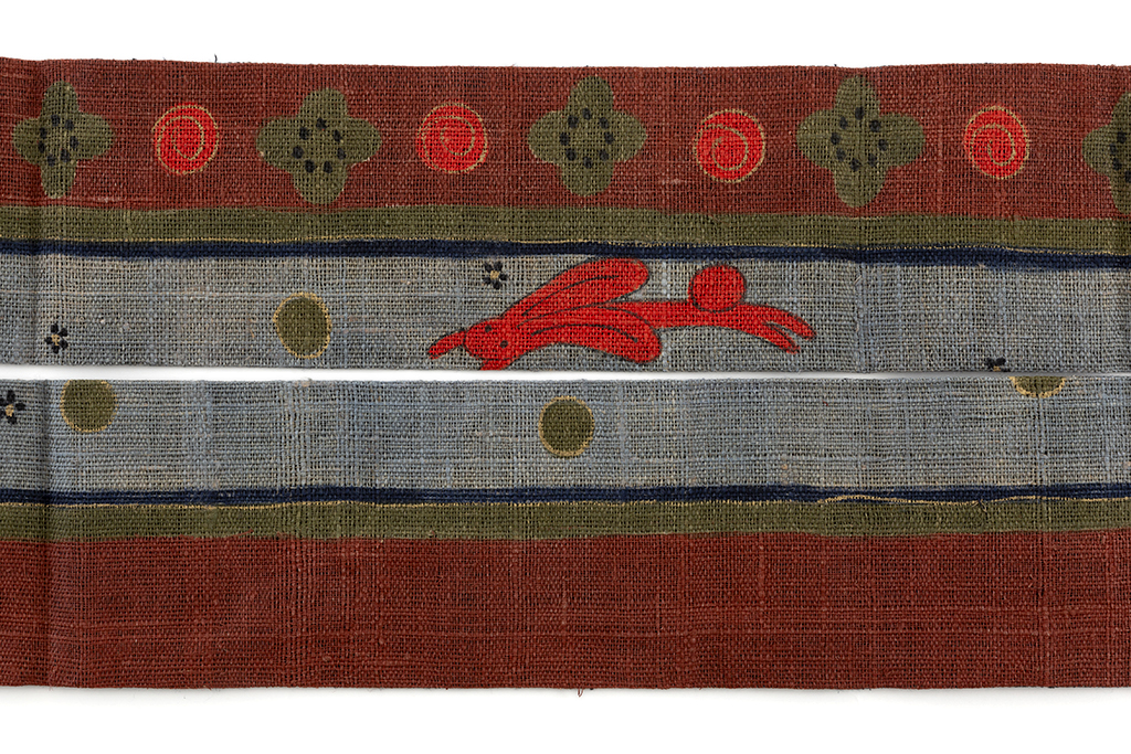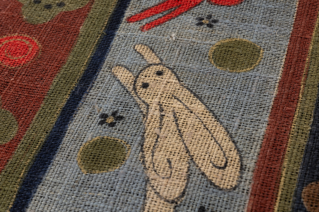 天青の科布地に、元気よく飛び跳ね、野を駆けるうさぎを描き、ふんわりと咲く小花とともに可愛らしい丸紋を配した、まるで絵本の世界から抜け出してきたかのような、朗らかで楽しい世界観が溢れ出す、山本由季さん作 科布地 九寸名古屋帯です。