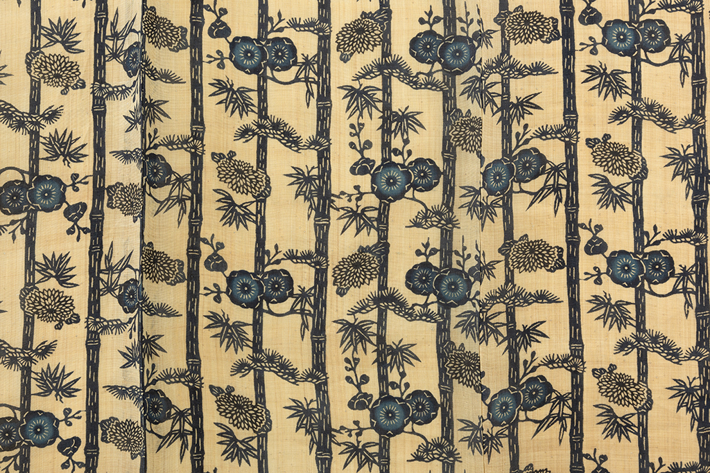 軽やかで独特の張りを備えた芭蕉布地に、藍の濃淡を用いて、すらりと背丈を伸ばす竹を並べ、艶やかな梅や菊、松葉や笹の葉などを紅型染めした、経に配された竹が流れるような美しい装いを実現し、竹から除く可愛らしい草花が豊かな表情を生む、涼しい風をはらむ玉那覇有公さん作 本紅型染 芭蕉布 着物です。