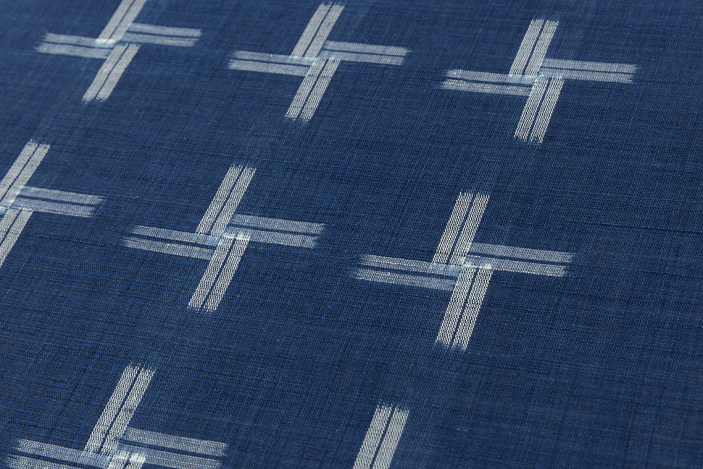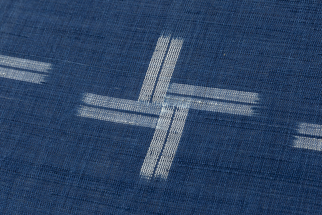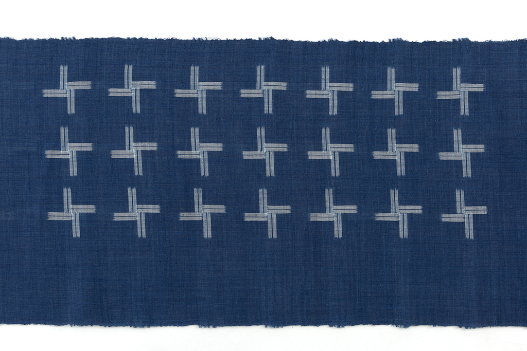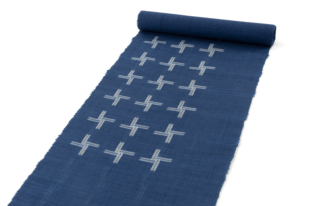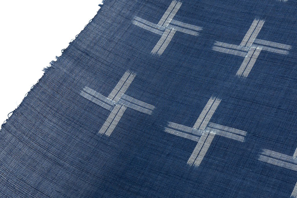 清涼感あふれる澄んだ紺青の苧麻糸を用いて手織りした八重山上布の地に、交差する絣模様で、整然と並ぶ十字のような絣を織り出した、繊細な糸・織が生む野趣豊かな味わいとともに爽やかで涼しげな風合いを生み出した八重山上布 九寸名古屋帯地です。