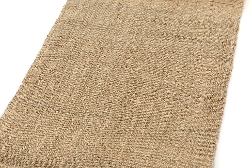 手績みの苧麻糸を地機で織り上げた、織りあがった後に湯もみをすることで生まれる凹凸感のあるシボが独特の風合いとともに涼しさを感じさせ、ざっくりとした織味が素材味のある野趣豊かな味わいとともにしなやかに風を通す重要無形文化財 小千谷縮 八寸名古屋帯です。