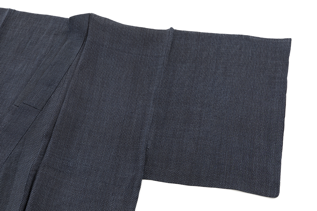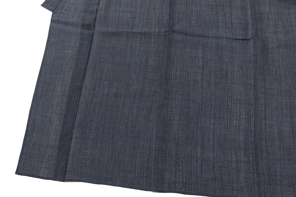紺色の地に、極め細かな蚊絣を織り出した、端正な景色が広がる、滑らかで張りのある肌触りが心地よく、薄く軽やかな涼しい風を通す宮古上布 男着物です。