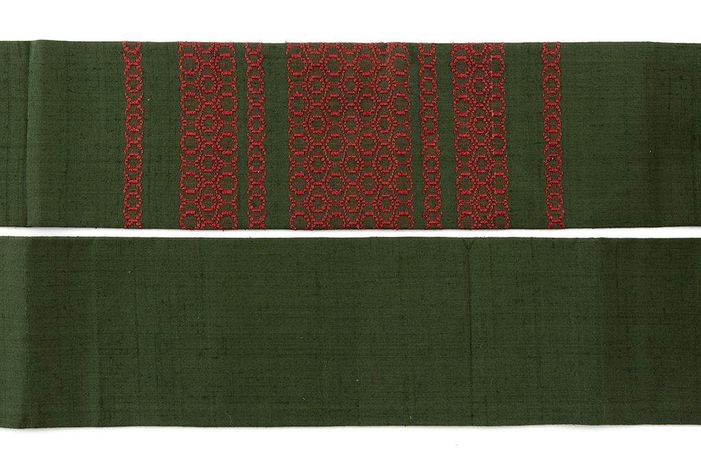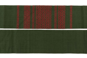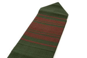 青漆の紬地に、ふっくらとした凹凸のある可愛らしい織で織り出されためがね織を幾何文のように連ね、落ち着いた横段に配した、国画会会員 原田麻那さん作 めがね織 紬九寸名古屋帯です。