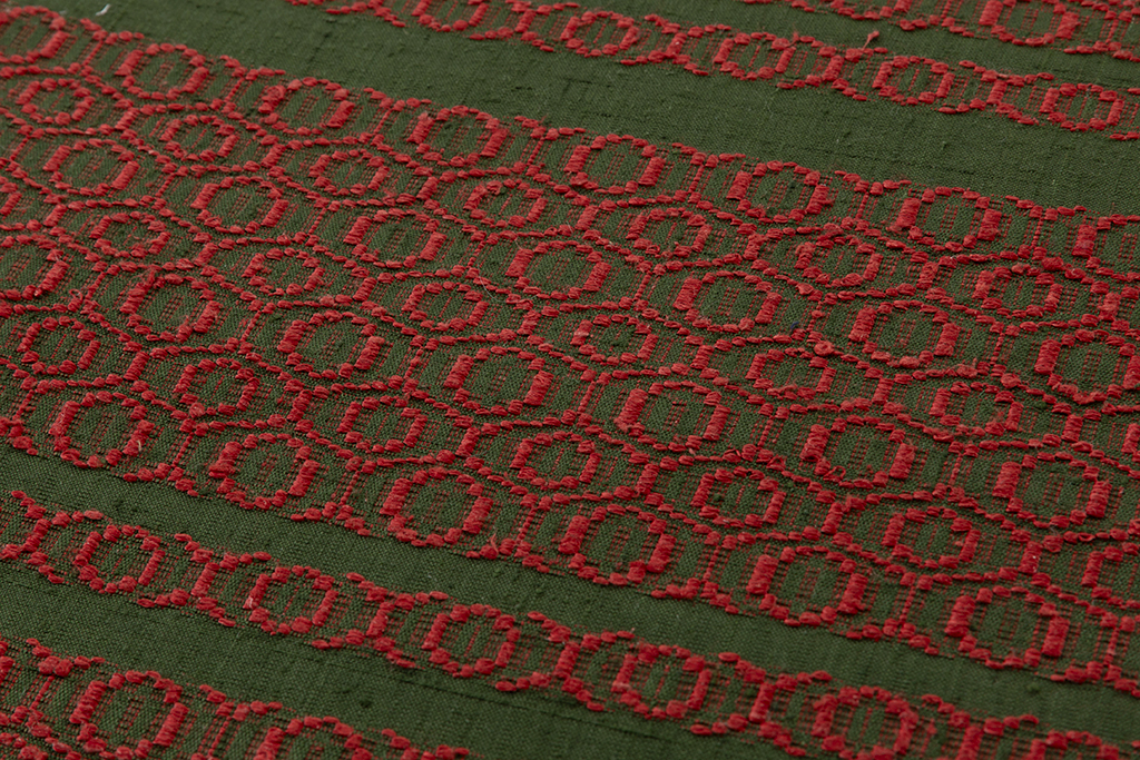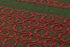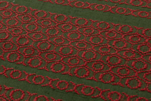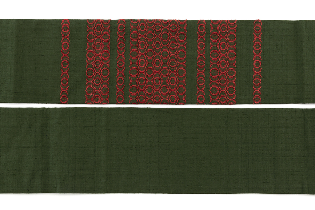 独創的なスタイルのデザインや色使いは、万葉集の詩からであったり、南伊豆の海からであったり、雅楽の羅陵王や王鐘調であったり、シルクロードのイメージからであったりと、見たり聞いたりした様々なものを頭の中で膨らませて抽象化されて織り表されたものだそうです。