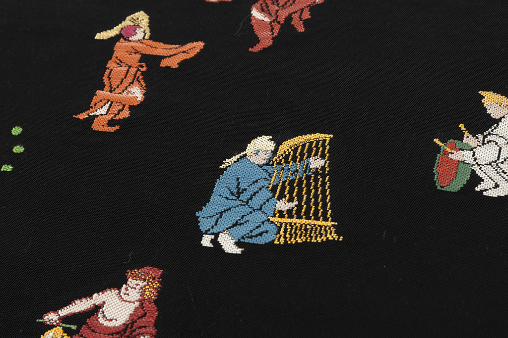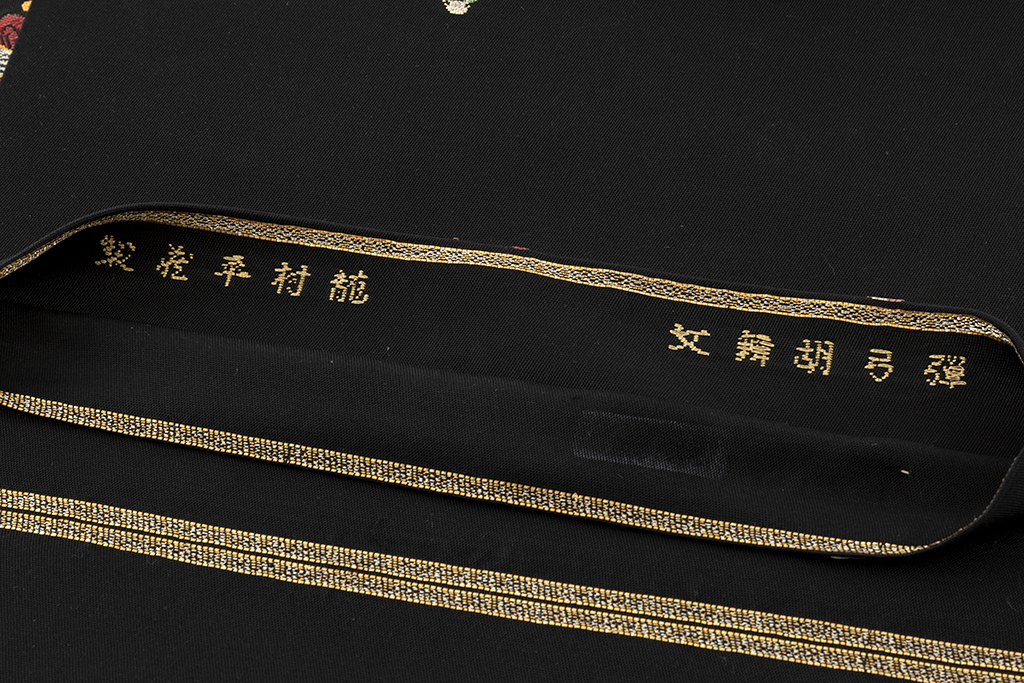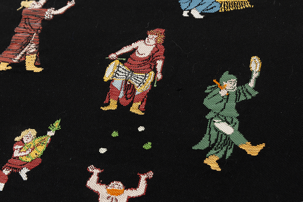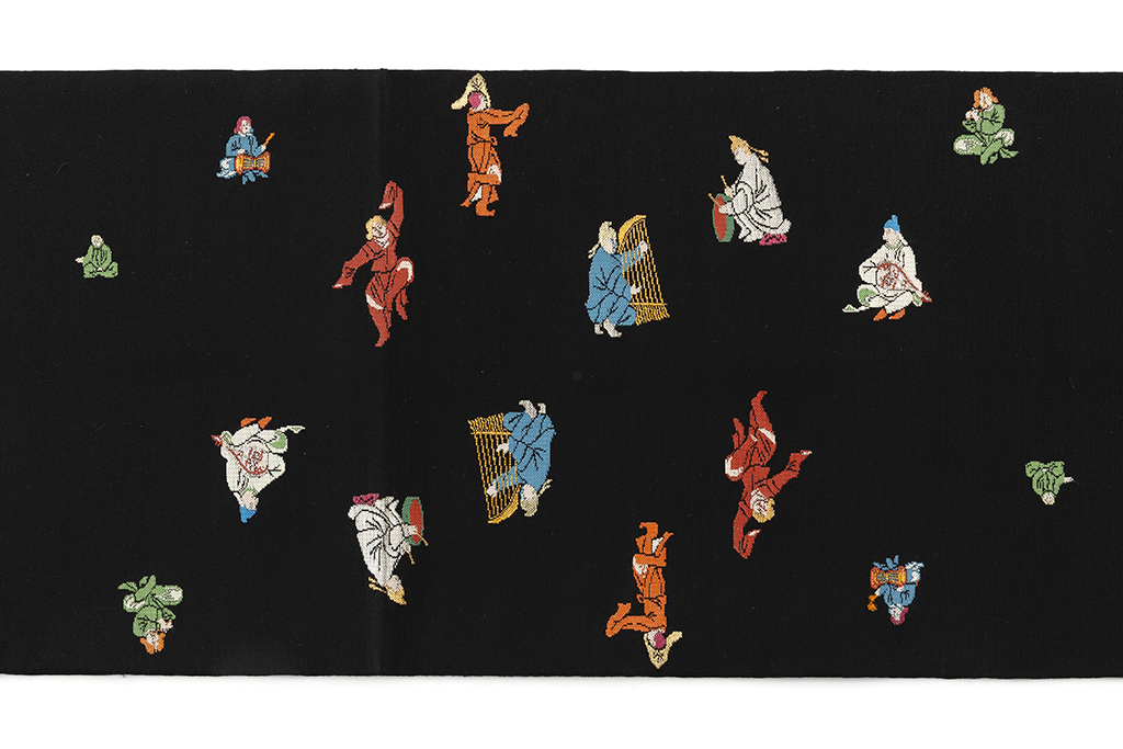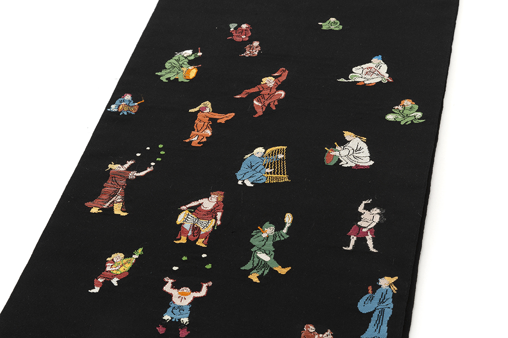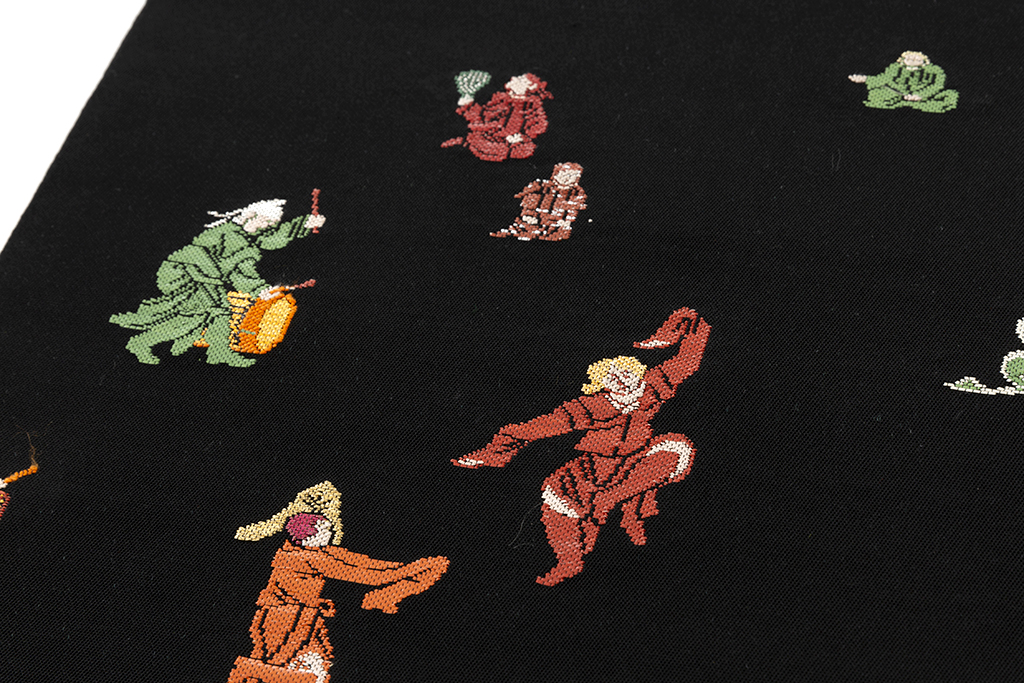 黒の地に、楽器を奏で、舞を踊り、芸を披露する様々な人々を、細やかな織で表現した、楽しく味わい深い龍村平蔵製 袋帯 「弾弓胡舞文」です。