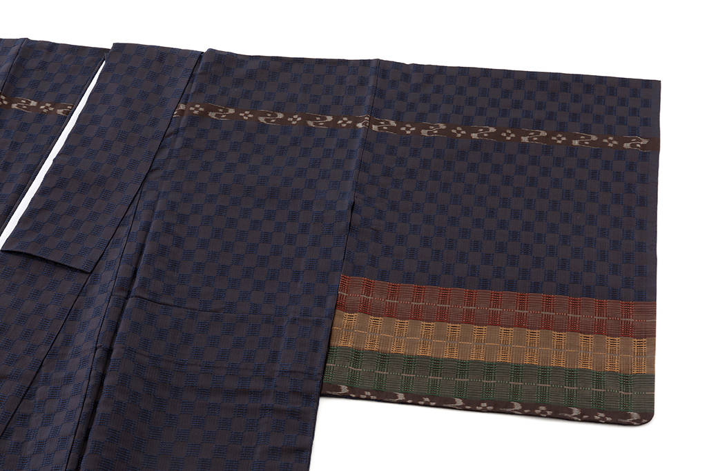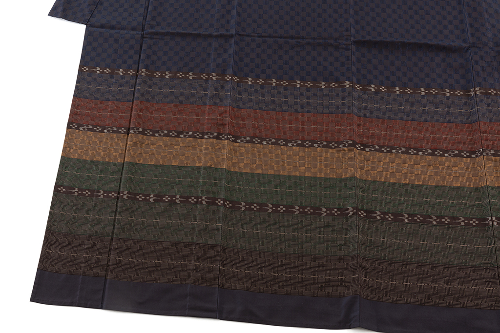 紺色の地に、端正に敷き詰められた花織を規則正しく織り出し、多彩な色使いの横段とともに細やかな絣柄を織り出した、透け感のある精緻な花倉織の陰影、鮮やかな色彩が豊かな表情を生む首里花倉織 訪問着です。