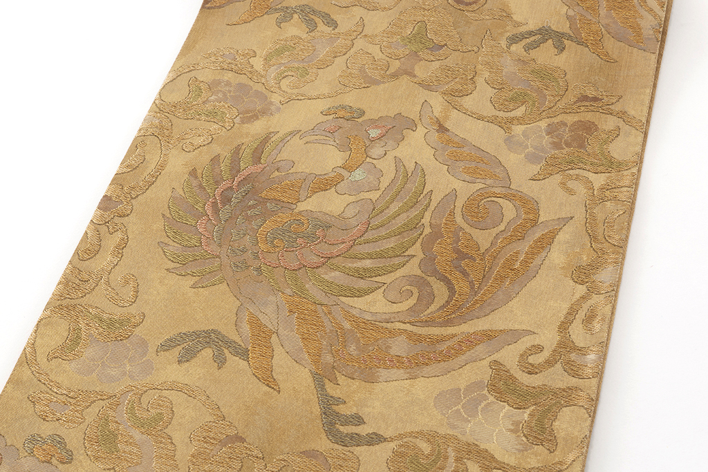 穏やかな光沢のある胡桃色の地に、落ち着いた色彩の色糸を用いて、威厳に満ちた堂々たる姿勢の鳳凰を力強く織り出した、洗練された綿密な織が際立つ洛風林製 袋帯です。