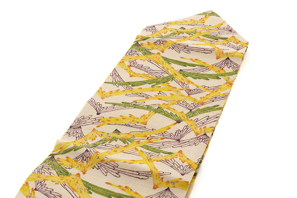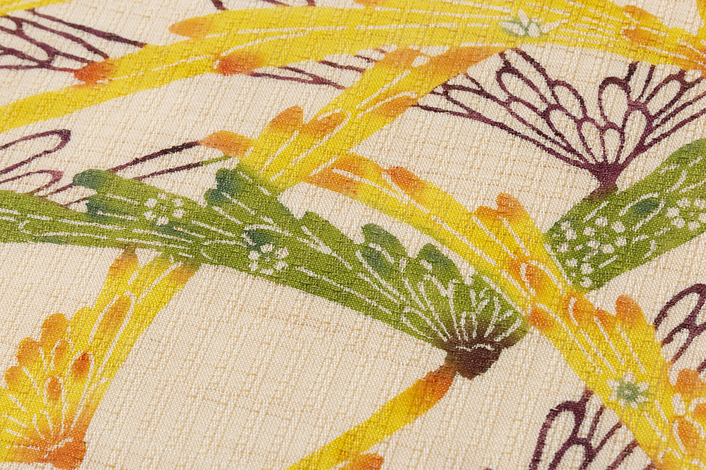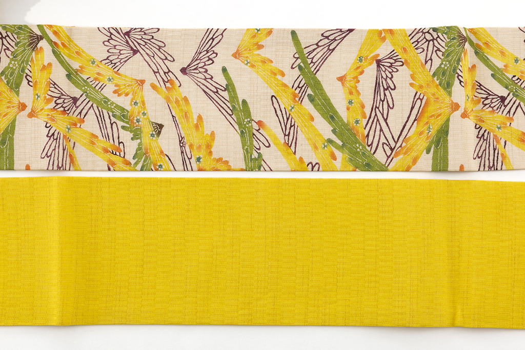 明るい黄と淡い砥粉色の地に、その身いっぱいに大きく花弁を咲き広げる花々を、鮮やかな色使いで描き、敷き詰めた、力強い生命の美しさ、優しい色彩が華やかな女性美を彩る作家の個性が光る九寸名古屋帯です。