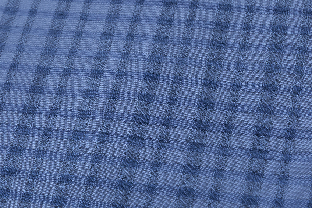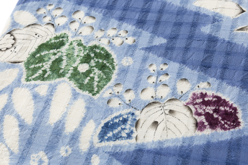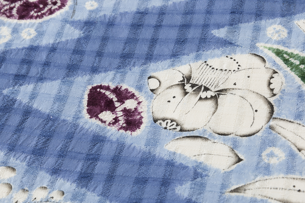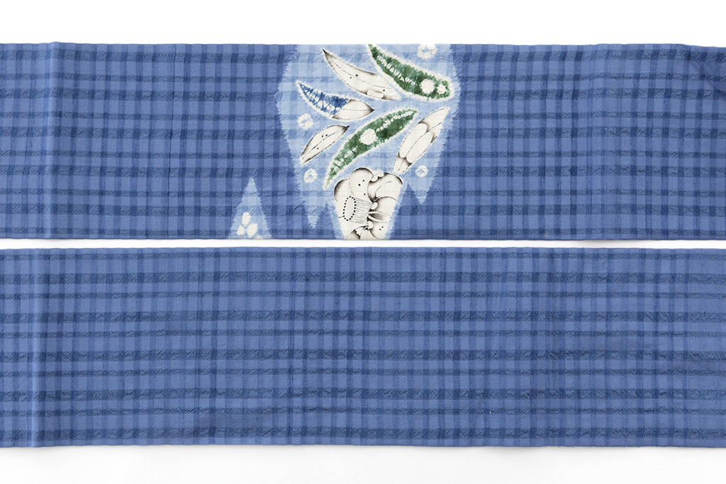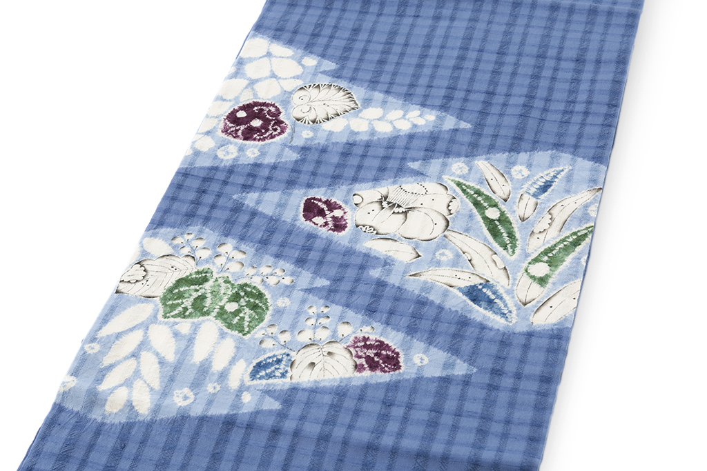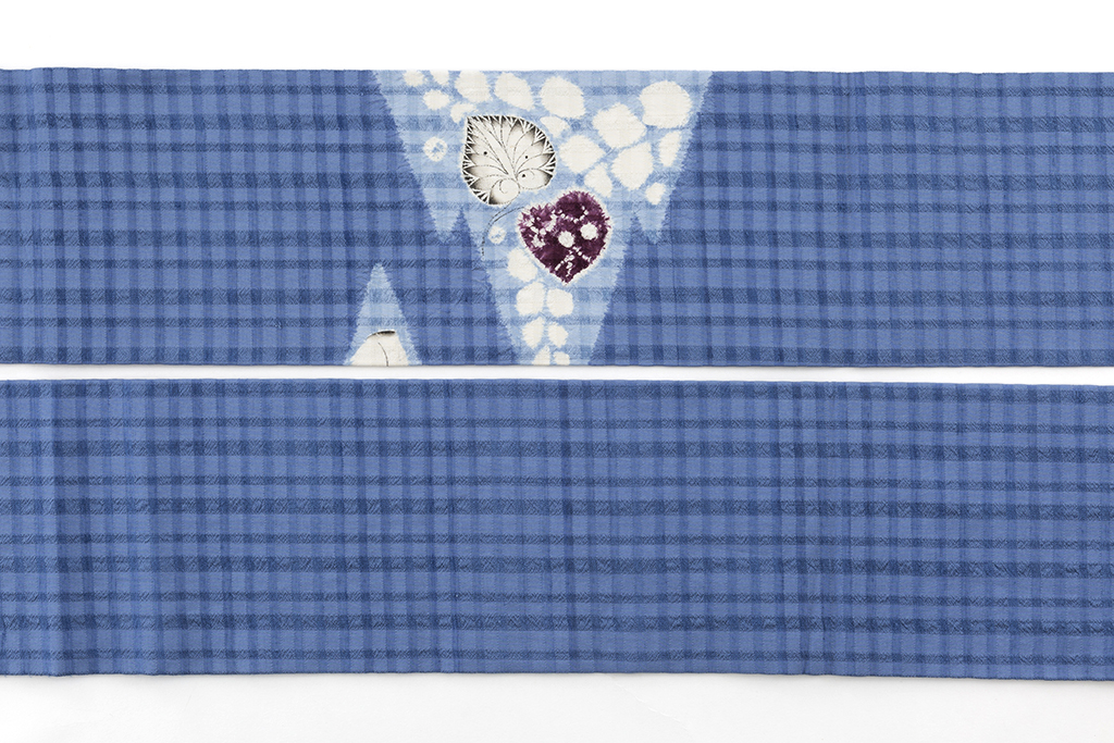 澄んだ移色の地に、可愛く重なる格子を織り出し、天青の縁取りに、瑞々しい草花とともに、艶やかに咲く辻ヶ花を際立つ墨書きと鮮やかな絞り染めで描いた、柔らかな絞りの滲みが品のある美しい着姿を演出する、小倉淳史さん作 紬九寸名古屋帯です。