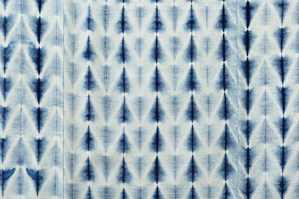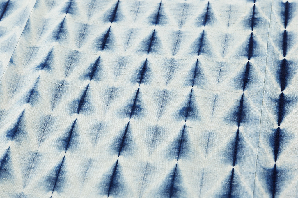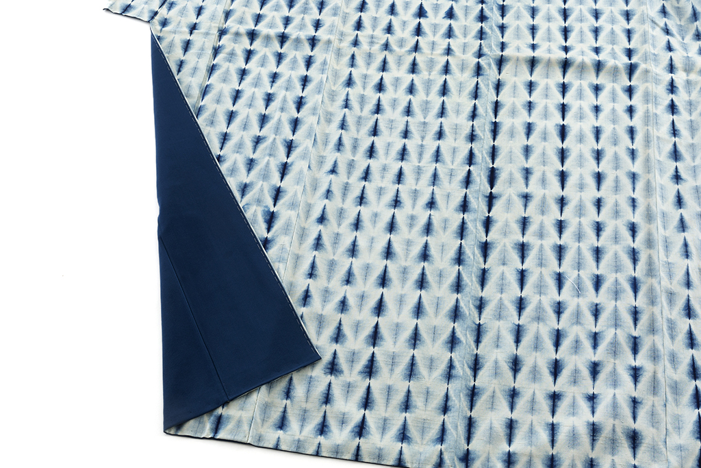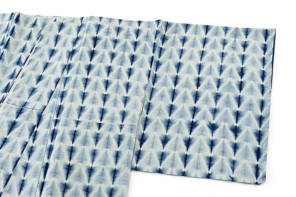 日本古来の正藍染を用いて連なる三角形のような幾何文を絞り染めした、藍の美しい濃淡、柔らかな滲みが、浮かび上がる藍の美しさを引き立て、透き通るように澄んだ藍の世界が広がる新道弘之さん作 正藍染 着物です。