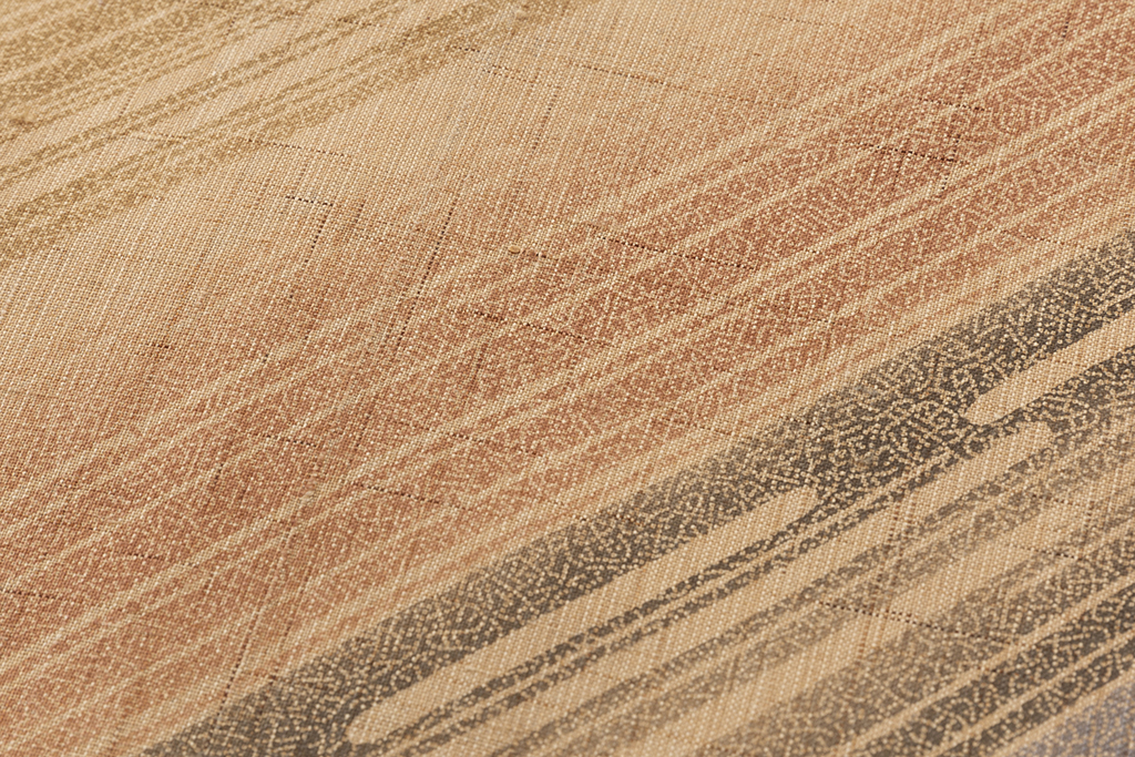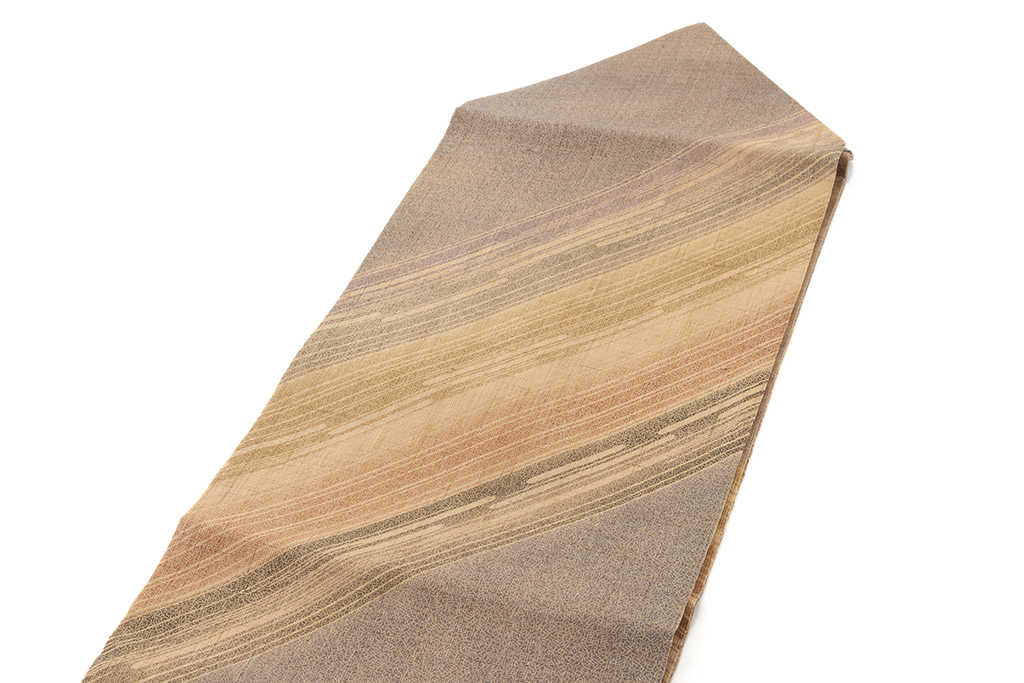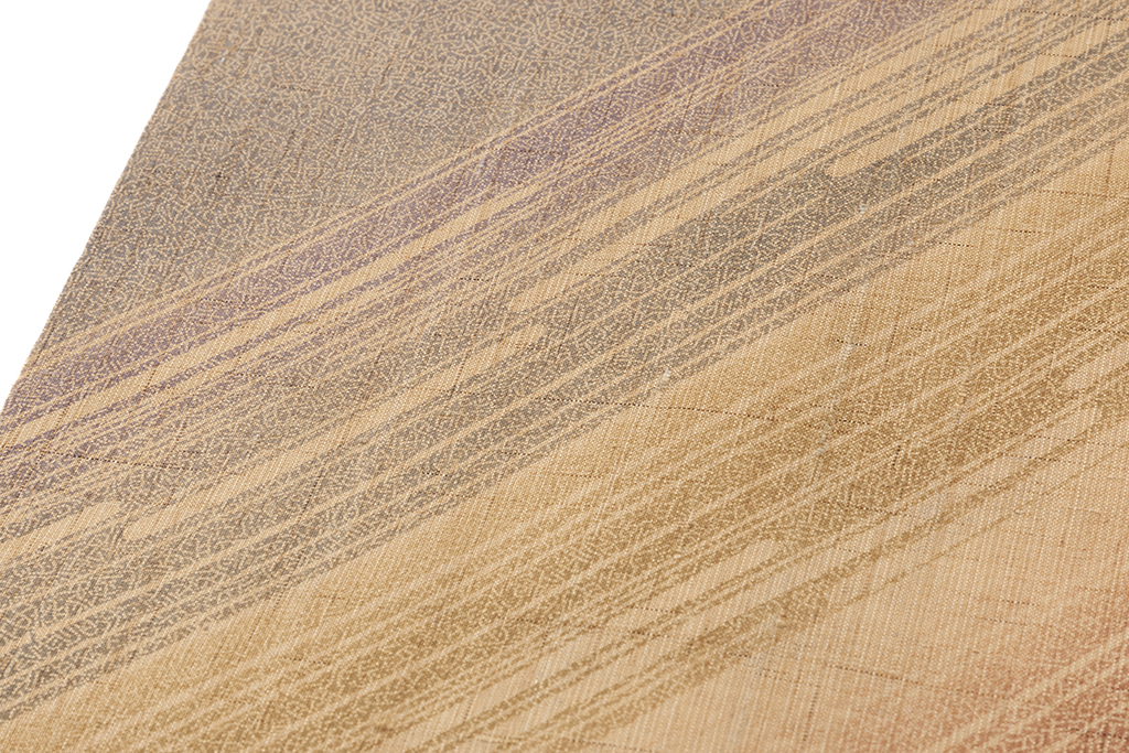素材味のある淡朽葉の紬地に、極め細かく精緻な小紋文様を敷き詰め、多彩な色使いで斜めに走る文様をすっきりと表現した、澄んだ色彩とモダンな表情が美しい着姿を整える日本工芸会正会員 藍田正雄さん作 紬地九寸名古屋帯です。