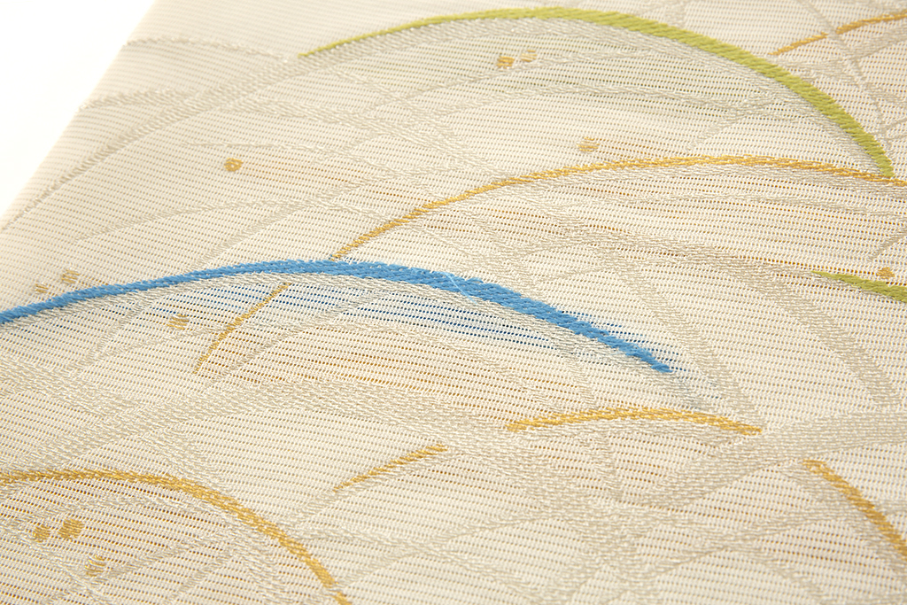 真珠色の絽の地に、煌めく金糸、銀糸、明るい色糸を用いて、日の光を浴びて心地よい輝きを放つ、つゆ草のような植物が風に吹かれ揺らめき合う、和やかな情景を描いた柔らかく穏やかな風がそよぐ、龍村美術織物製 夏袋帯 「揺映文」です。