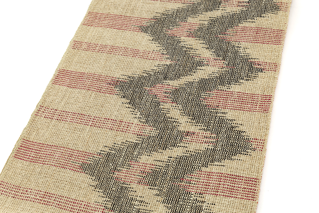 蒸栗色のお色に、赤や墨で横段や流れる幾何文様を織り出した、藤の花の美しさを連想させる微かに紫がかった色合い、藤の繊維の柔らかみがしっとりと優しい手触りを生む、藤布 八寸名古屋帯です。