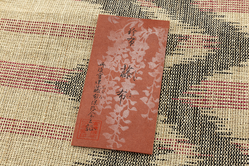 藤布(ふじふ)とは藤の蔓を細く剥いで糸を作り織り上げた布のこと。ざっくりとした素材で通気性の良さから、昔は夏衣の一つとして日常に使われていました。明治時代を迎え木綿の大量生産が可能になると同時に、藤布は衰退します。今では夏帯などで僅かに使用されるほど。藤布はいまやほとんど見ることができませんが、古来から近代まで日常使いに重宝されてきました。