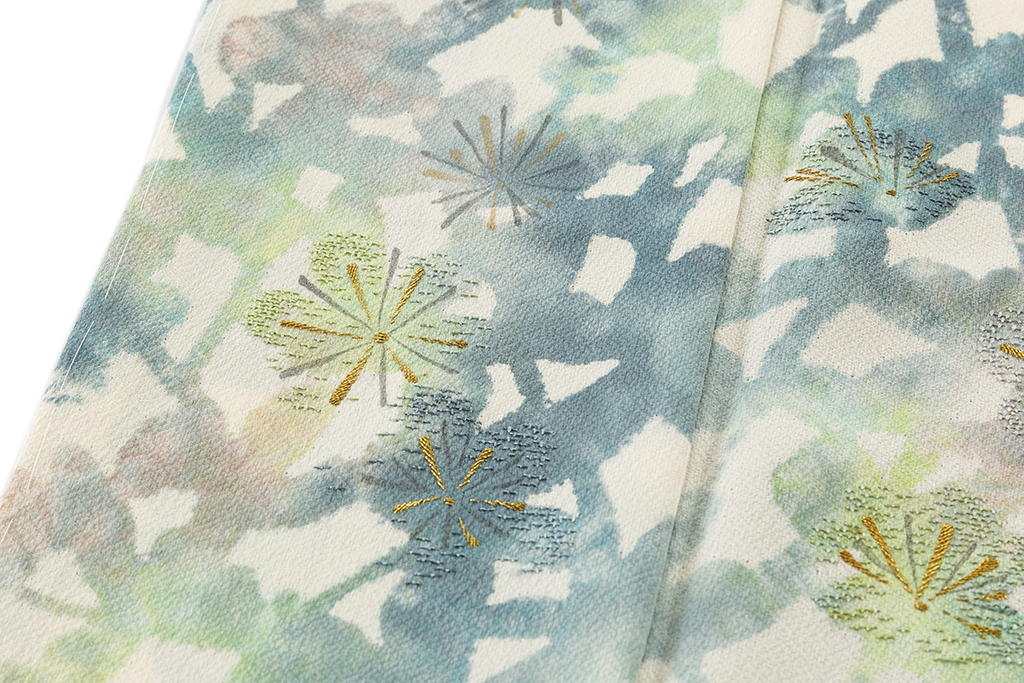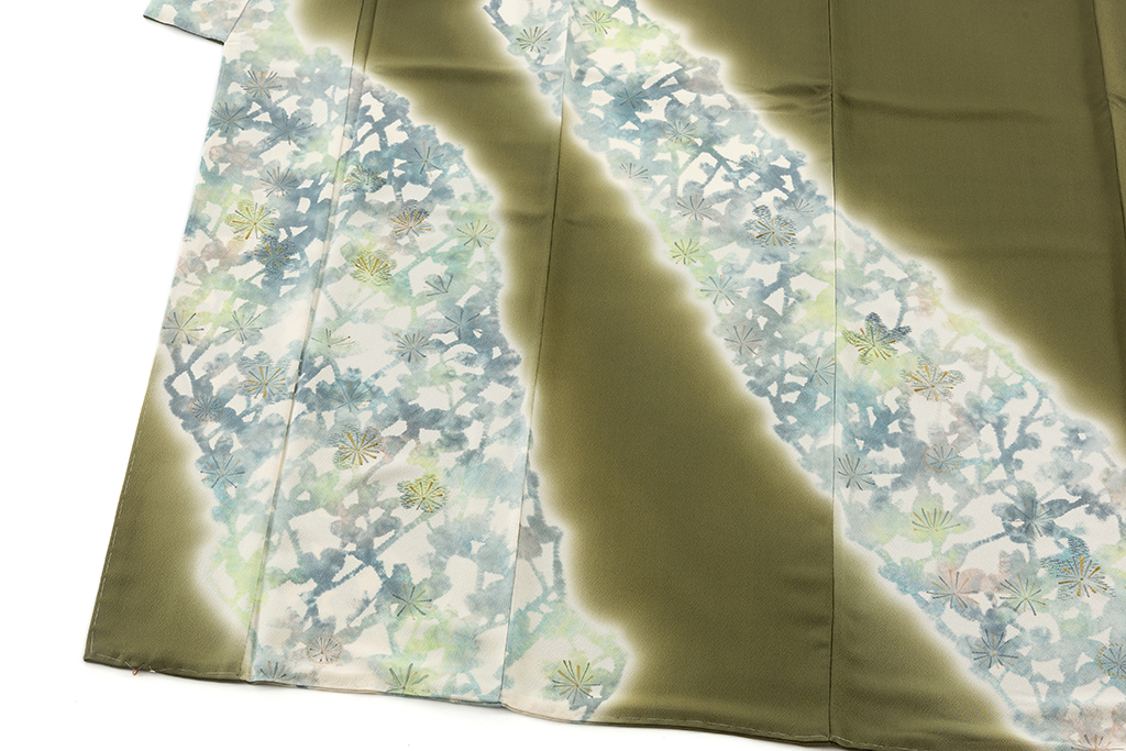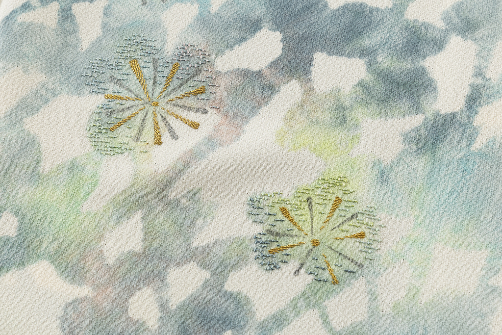 蜥蜴色の地に、美しく溶け合う様々な彩りに煌めく金糸、色糸の細かな刺繍を用いて、枝垂れ咲く花々を咲かせる木々を流れるように浮かべ、繊細な色差しで幻想的に表現した、淡く透明感ある色彩が柔らかな風合いを引き立てる日本工芸会正会員 木原明さん作の訪問着です。