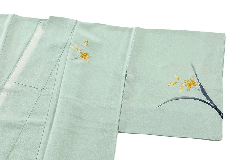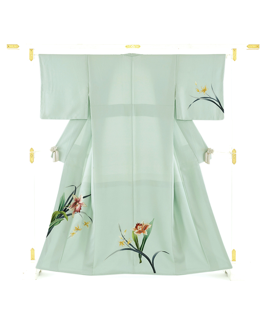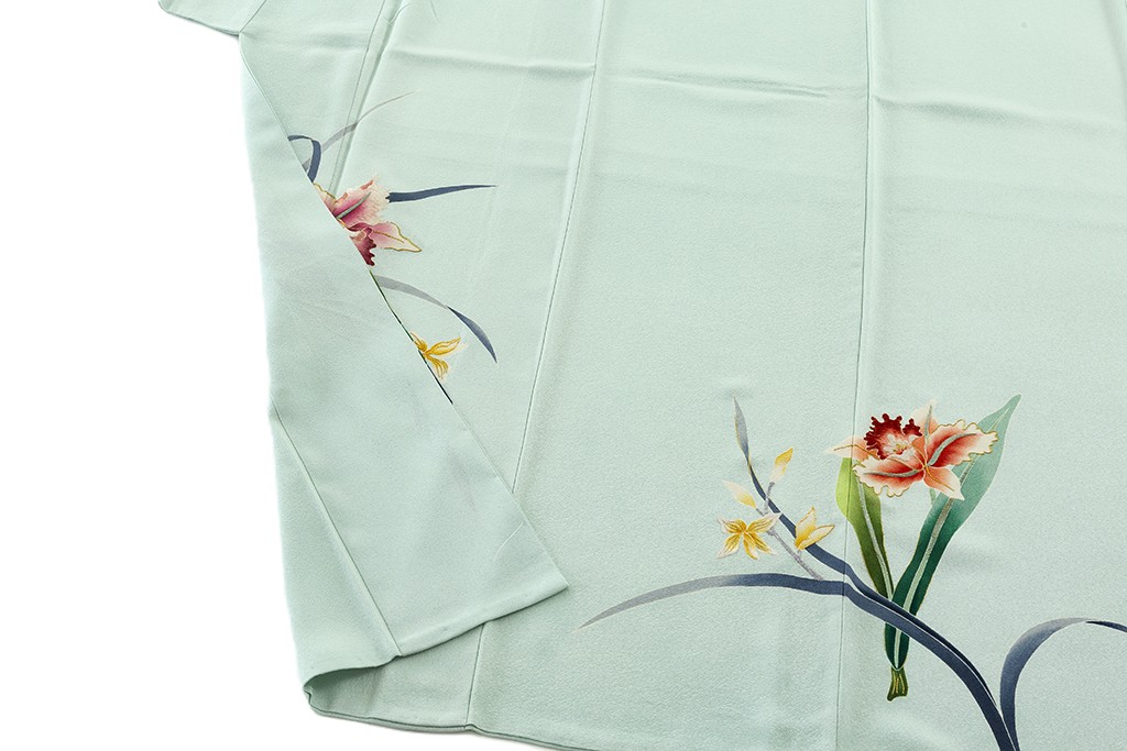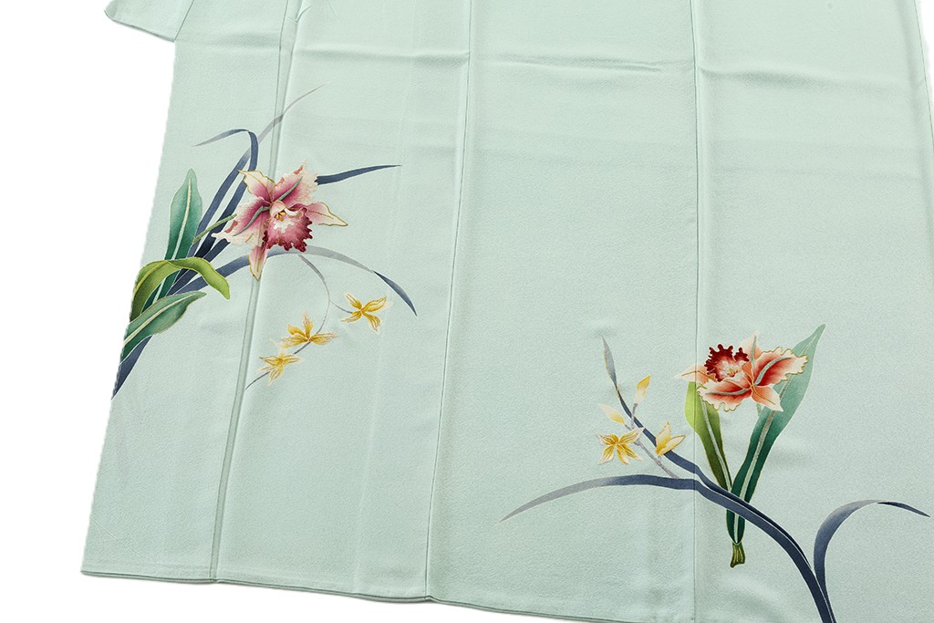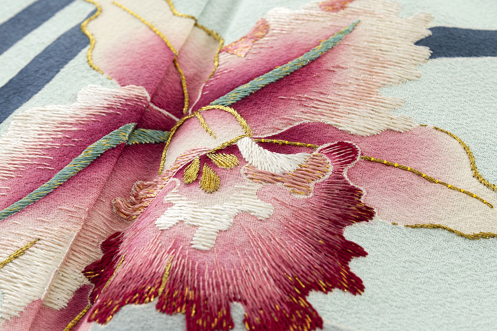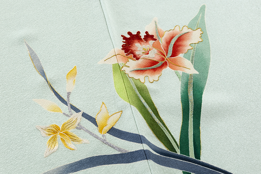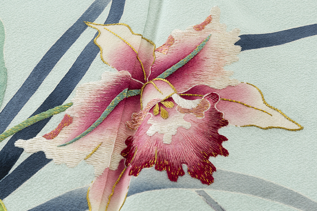 「織・染・繍・絞・絣」の向上を目指す高島屋の上品會同人でもあり、自由な発想から生まれる素晴らしい作品で、年代問わずファンの方が多い染繍工芸 大羊居さんの訪問着。爽やかな地色に描かれた大きなカトレア、刺繍で花弁のグラデーション、立体感を表現されています。
