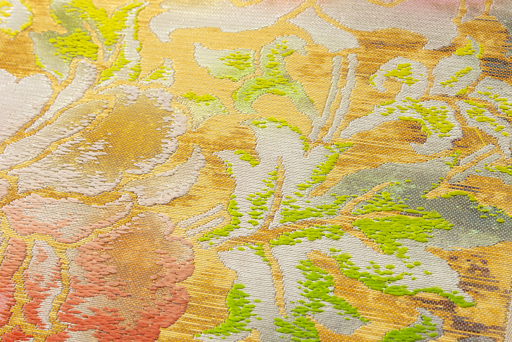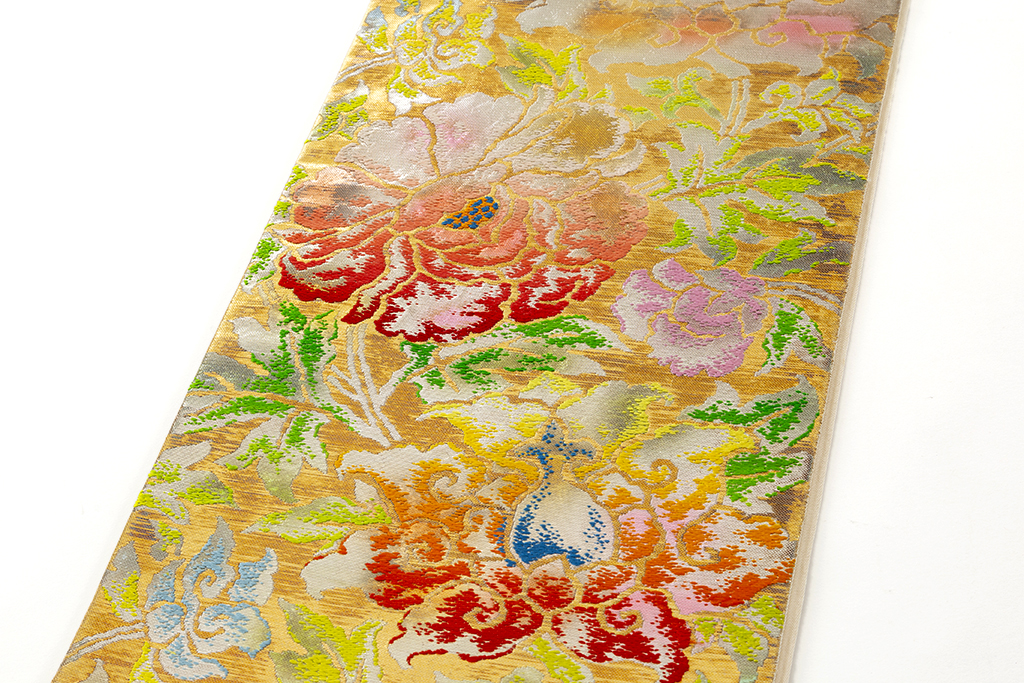 練色の地に、煌めく金箔と銀箔に鮮やかな色糸の刺繍を用いて、艶やかな牡丹の花と葉を大胆に織り出した、色彩豊かな輝きが大変華やかな格調高い龍村平蔵製 袋帯 「松嶋牡丹錦」です。
